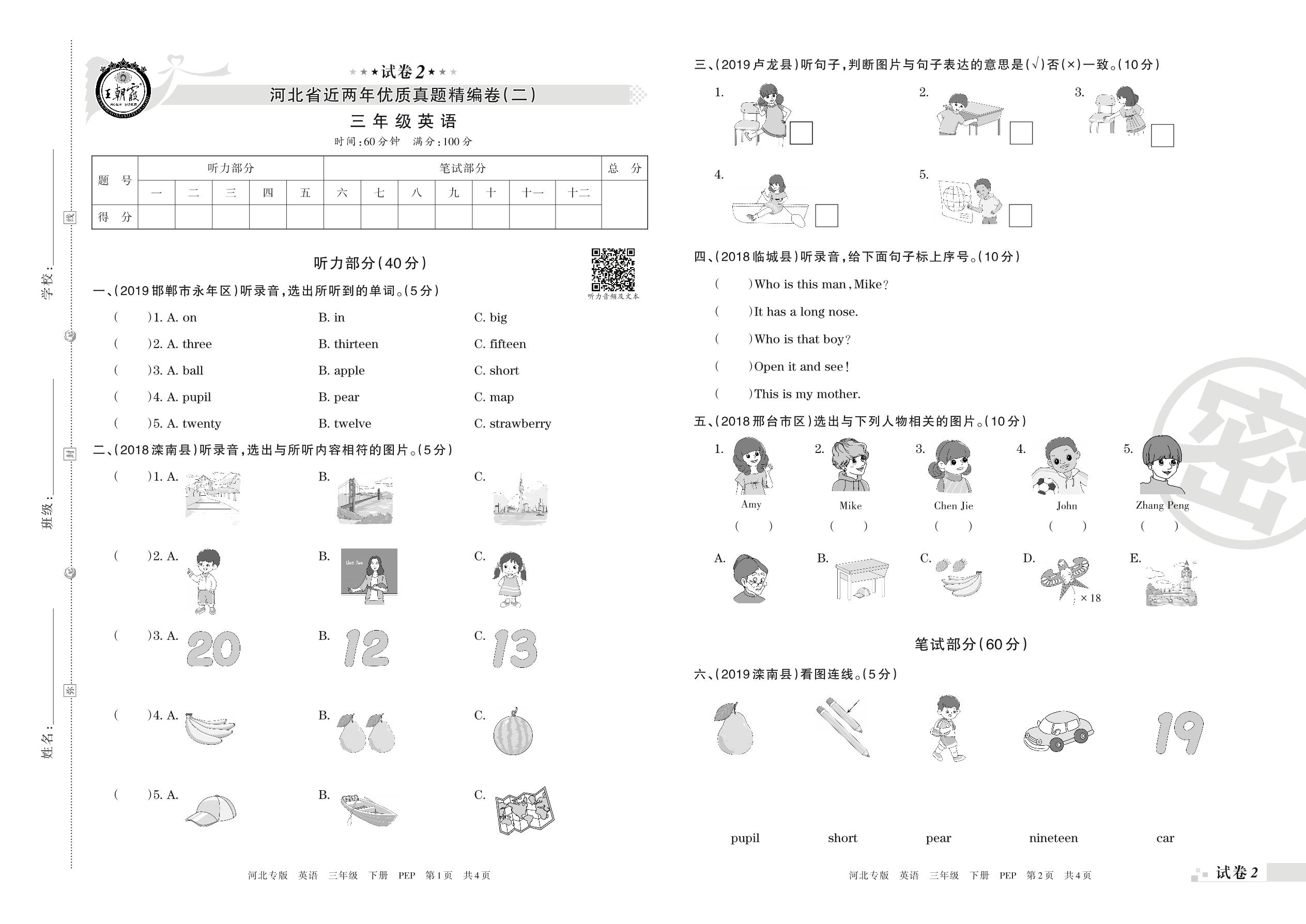 河北省近两年优质真题精编卷(二)三年级下册英语(PEP版)【2】