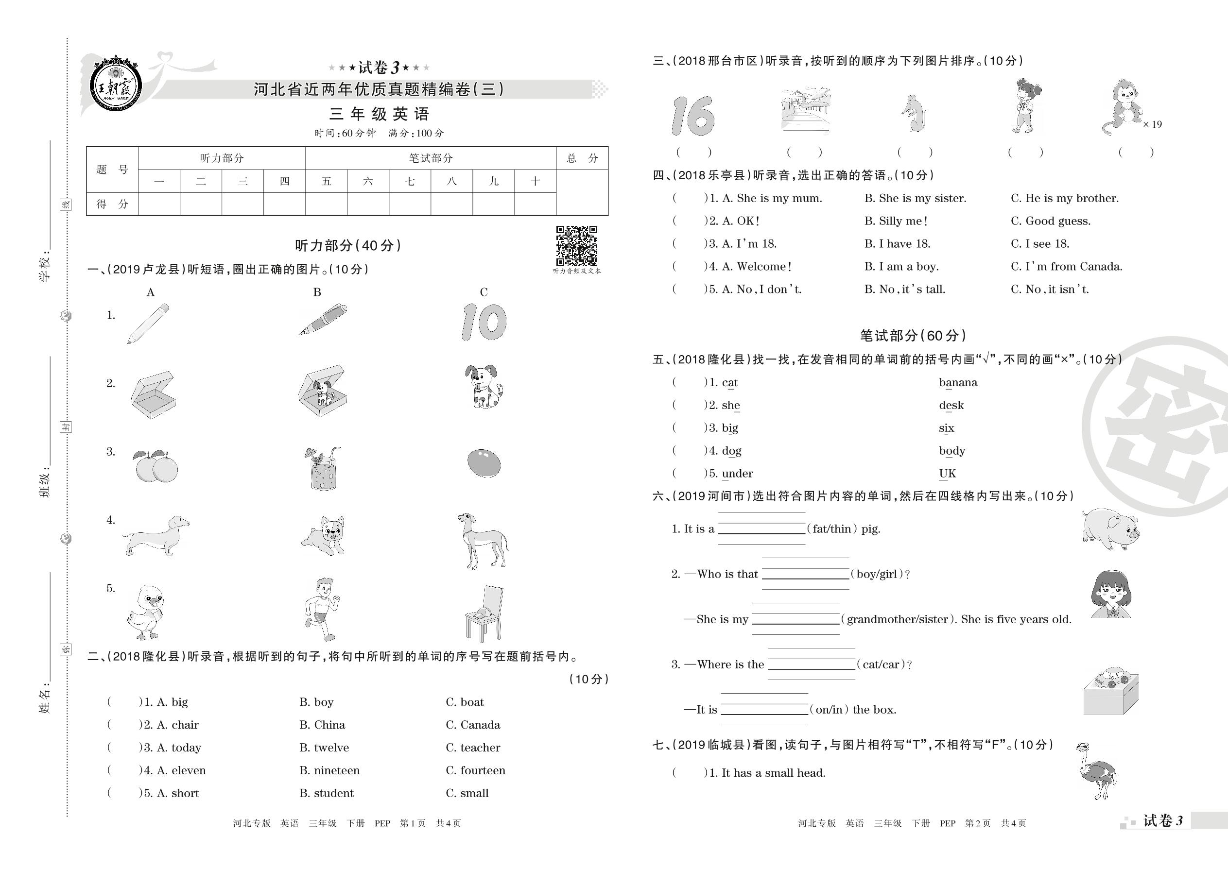 河北省近两年优质真题精编卷(三)三年级下册英语(PEP版)【3】