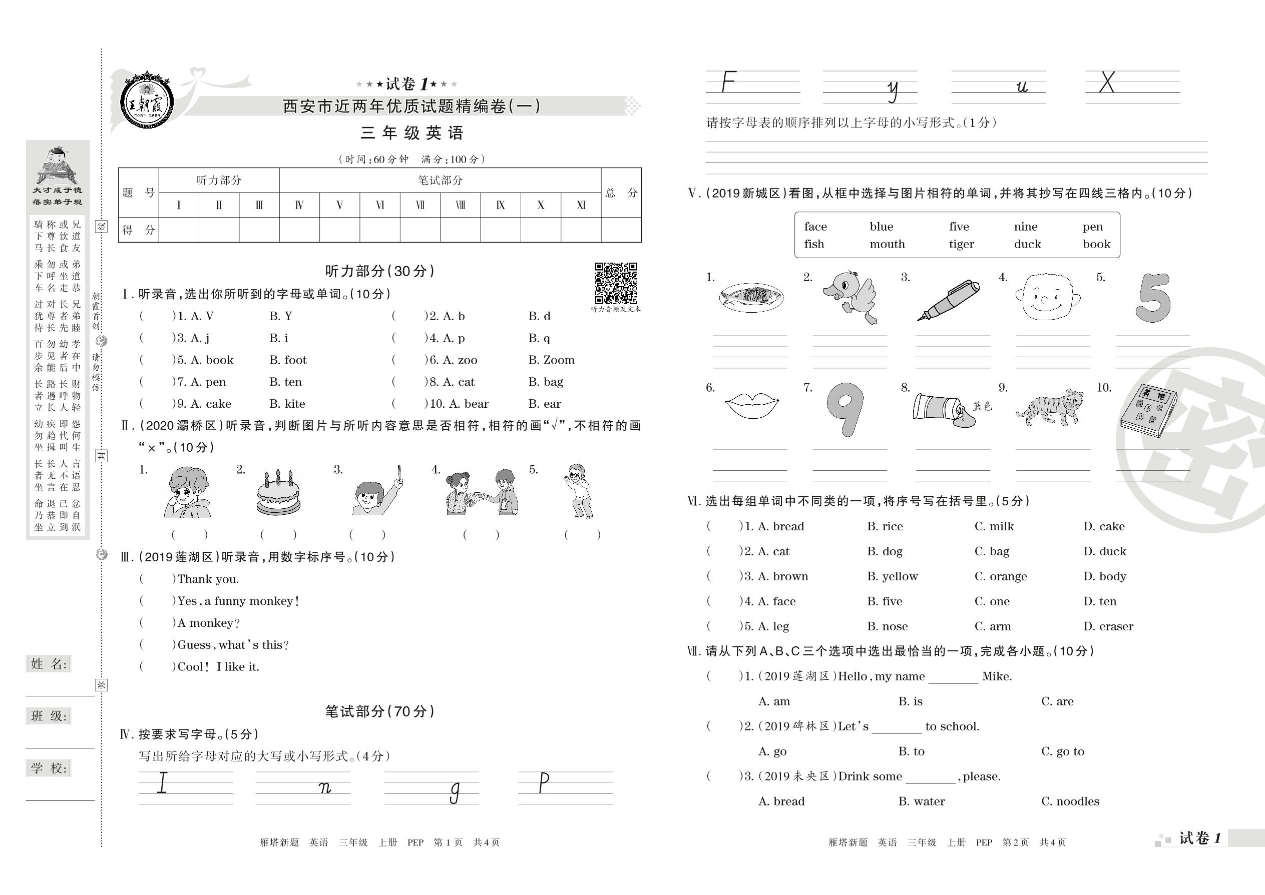 西安市近两年优质试题精编卷(一)三年级上册英语(PEP版)【1】