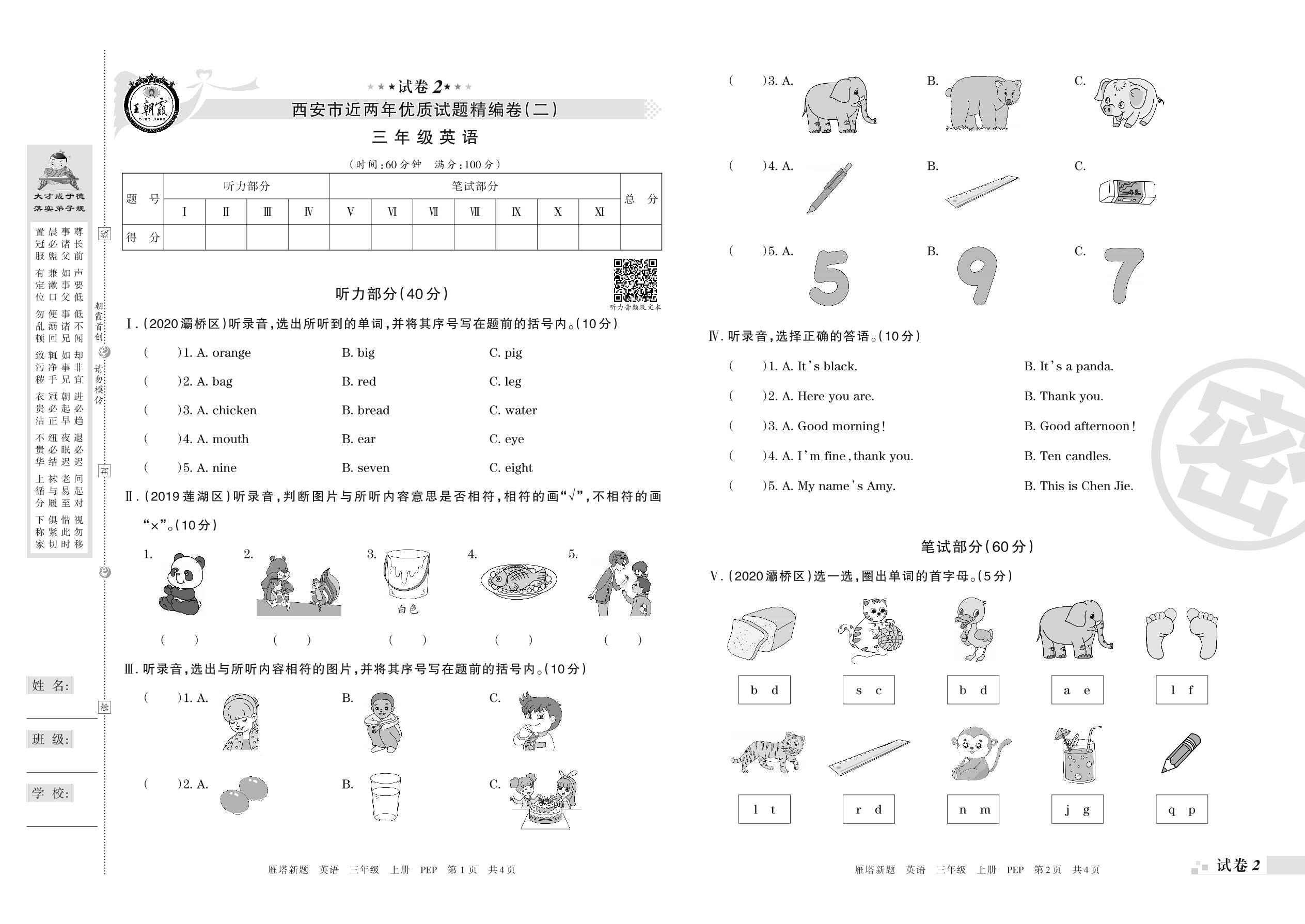 西安市近两年优质试题精编卷(二)三年级上册英语(PEP版)【2】