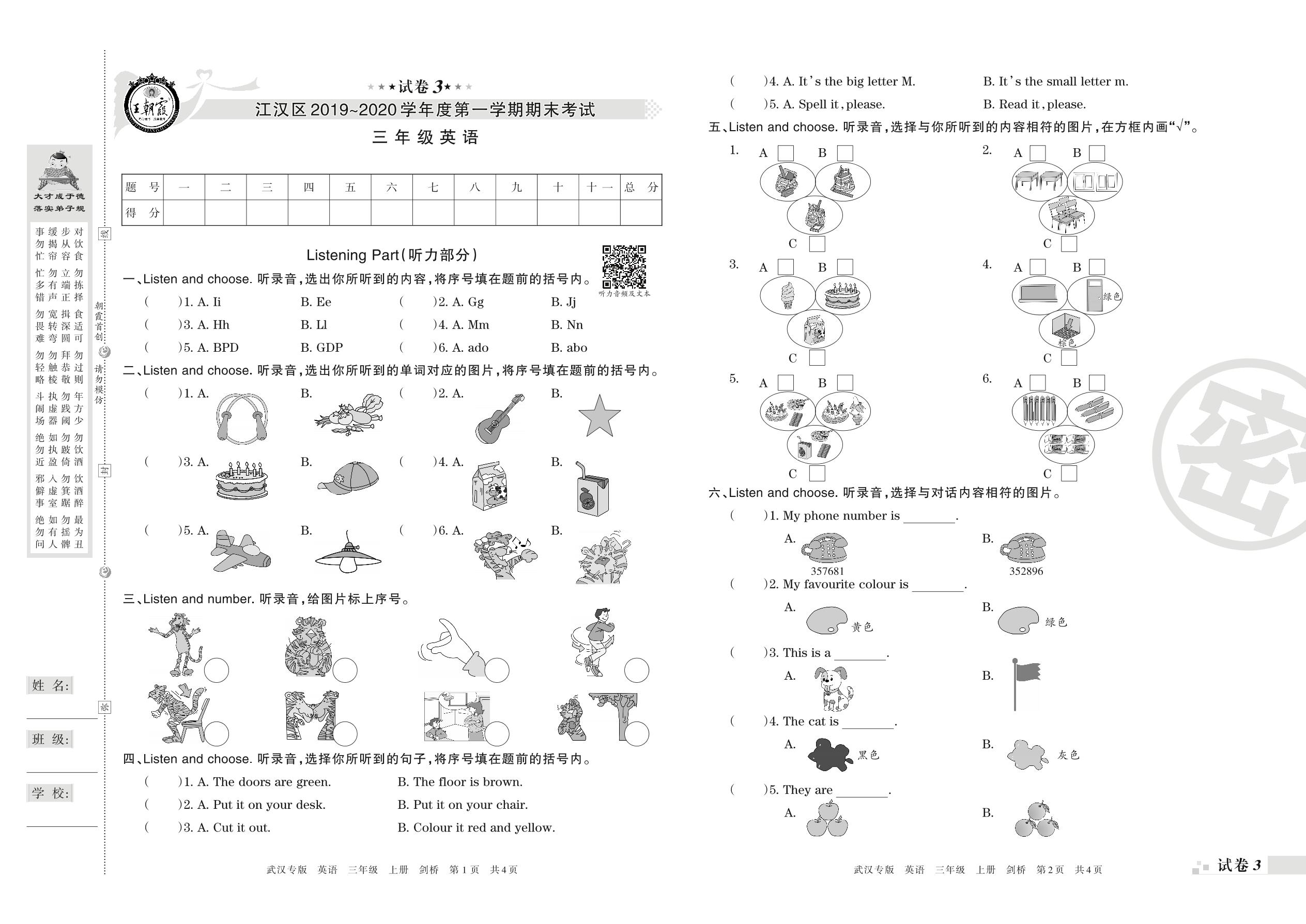 2019-2020学年第一学期武汉市江汉区三年级英语试卷(剑桥版)【3】