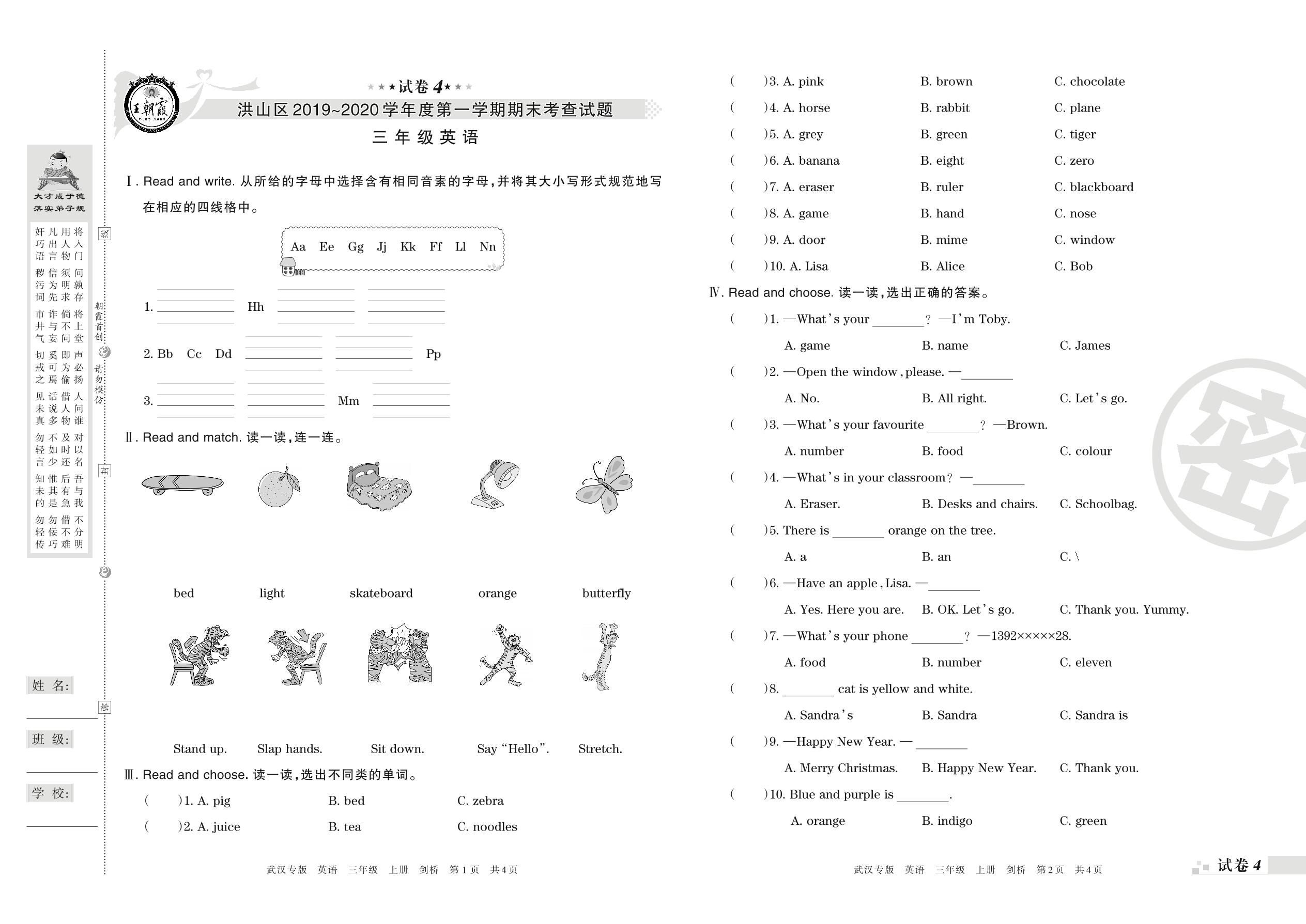 2019-2020学年第一学期武汉市洪山区三年级英语试卷(剑桥版)【4】