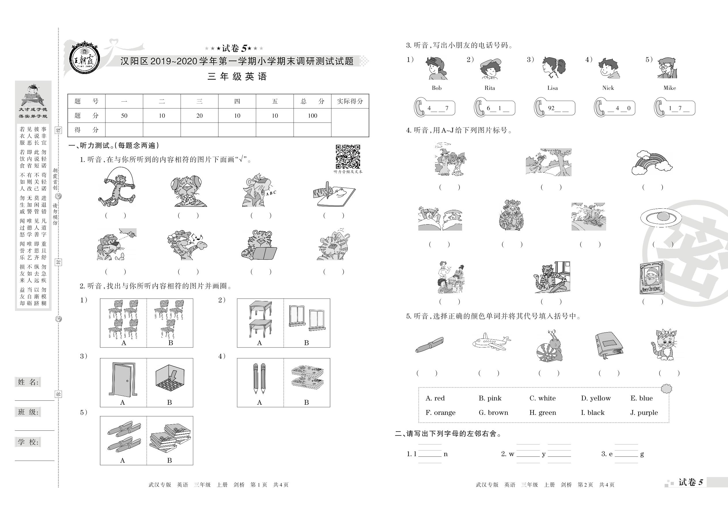 2019-2020学年第一学期武汉市汉阳区三年级英语试卷(剑桥版)【5】