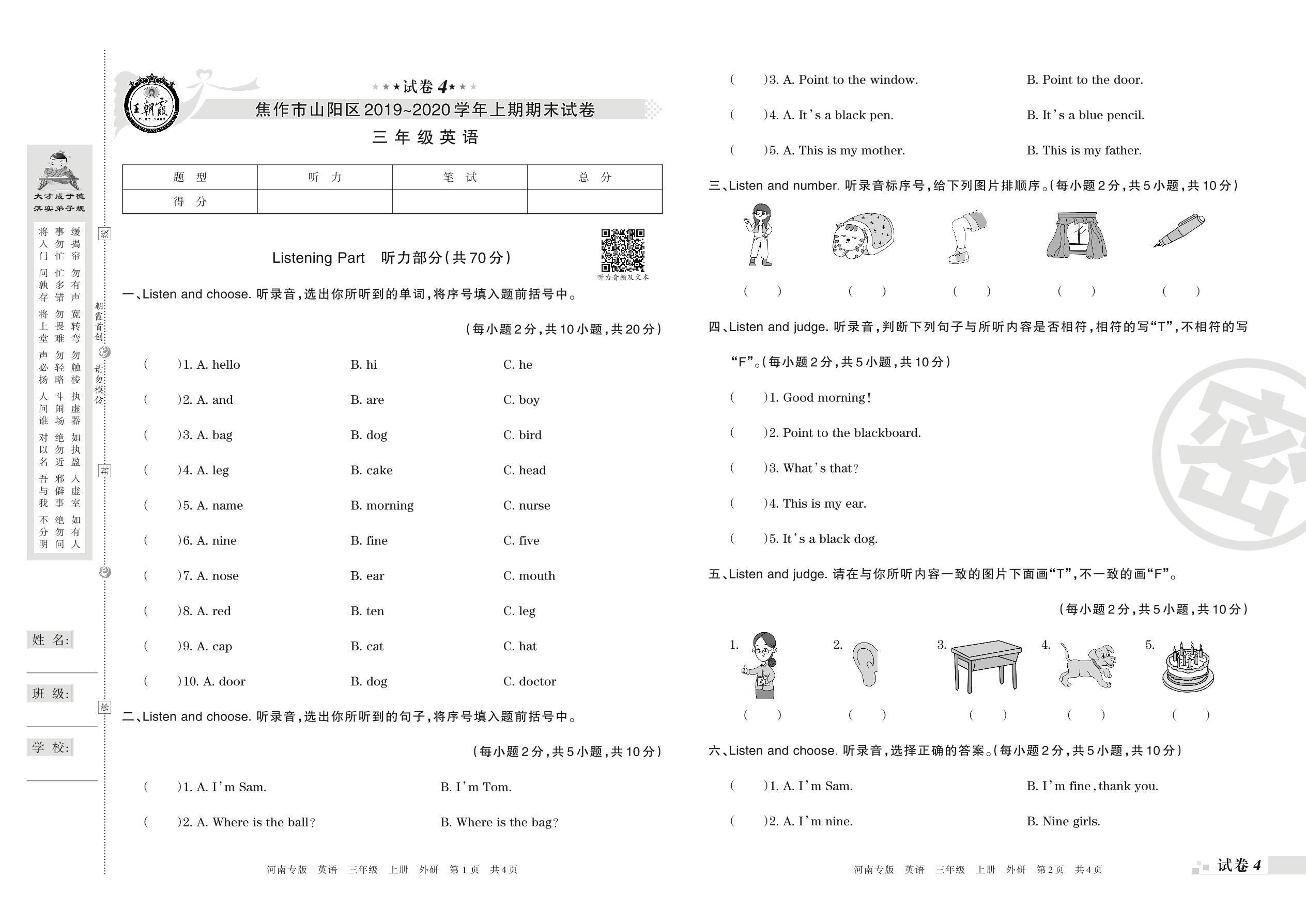 2019-2020学年第一学期焦作市山阳区三年级英语试卷(外研版)【4】