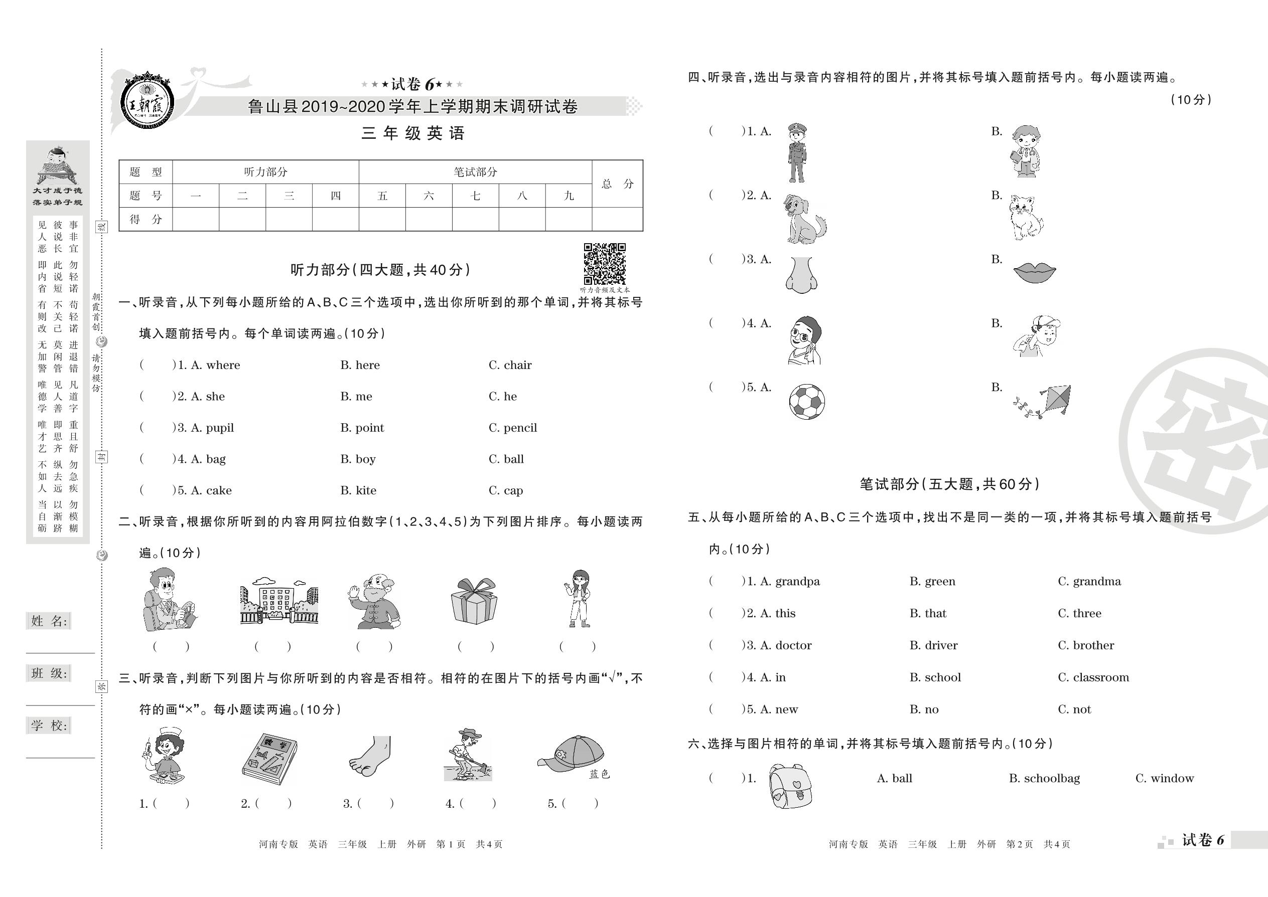 2019-2020学年第一学期平顶山市鲁山县三年级英语试卷(外研版)【6】