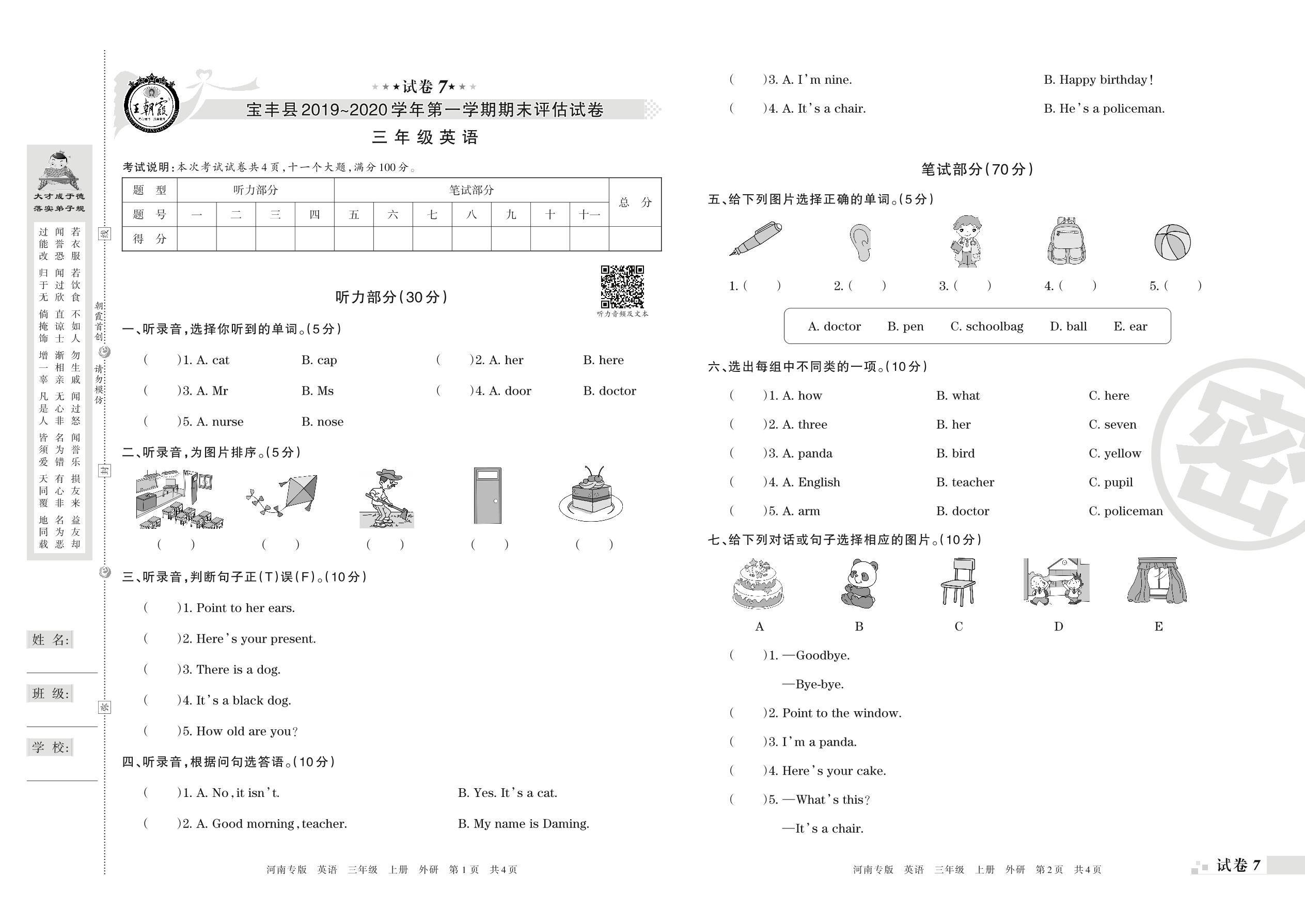 2019-2020学年第一学期平顶山市宝丰县三年级英语试卷(外研版)【7】