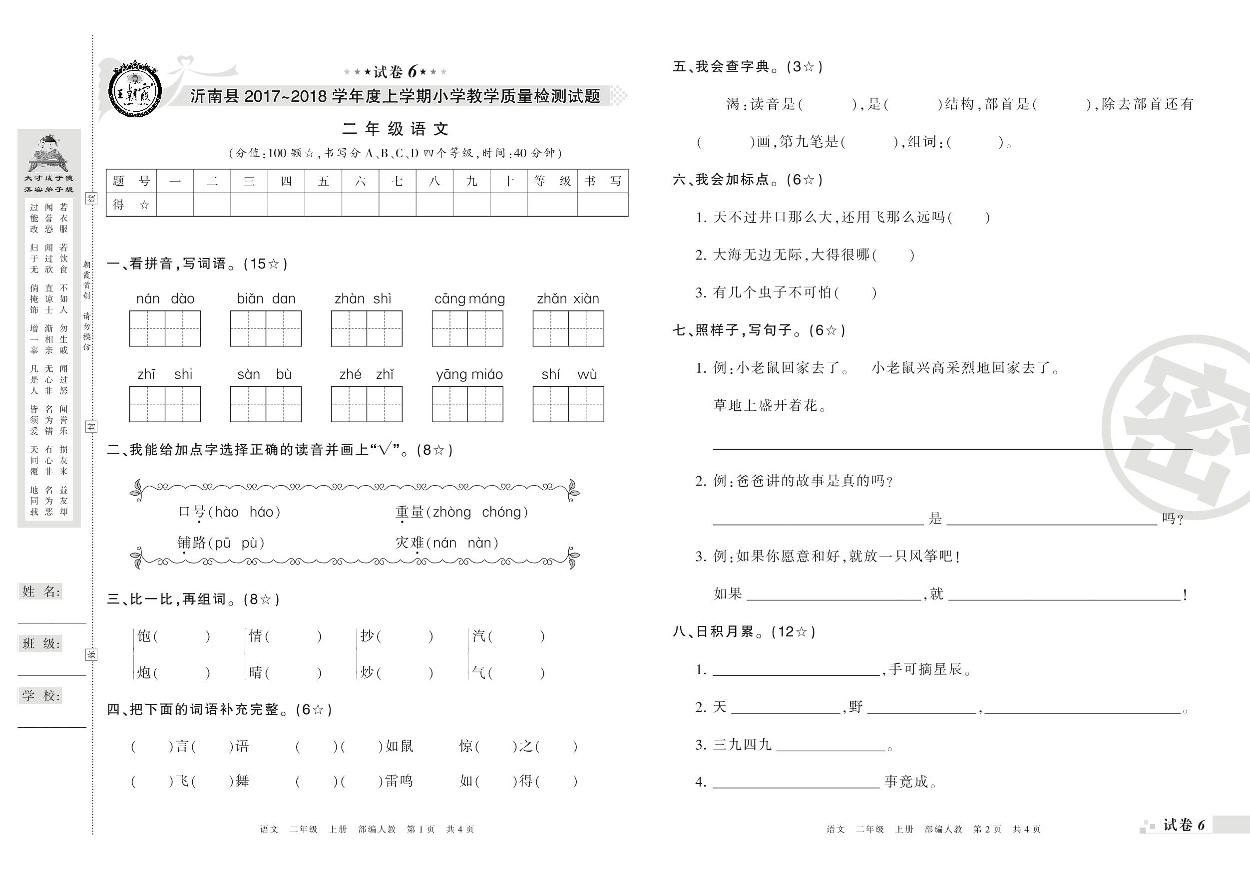 2017-2018学年第一学期临沂市沂南县二年级语文试卷(人教版)【6】
