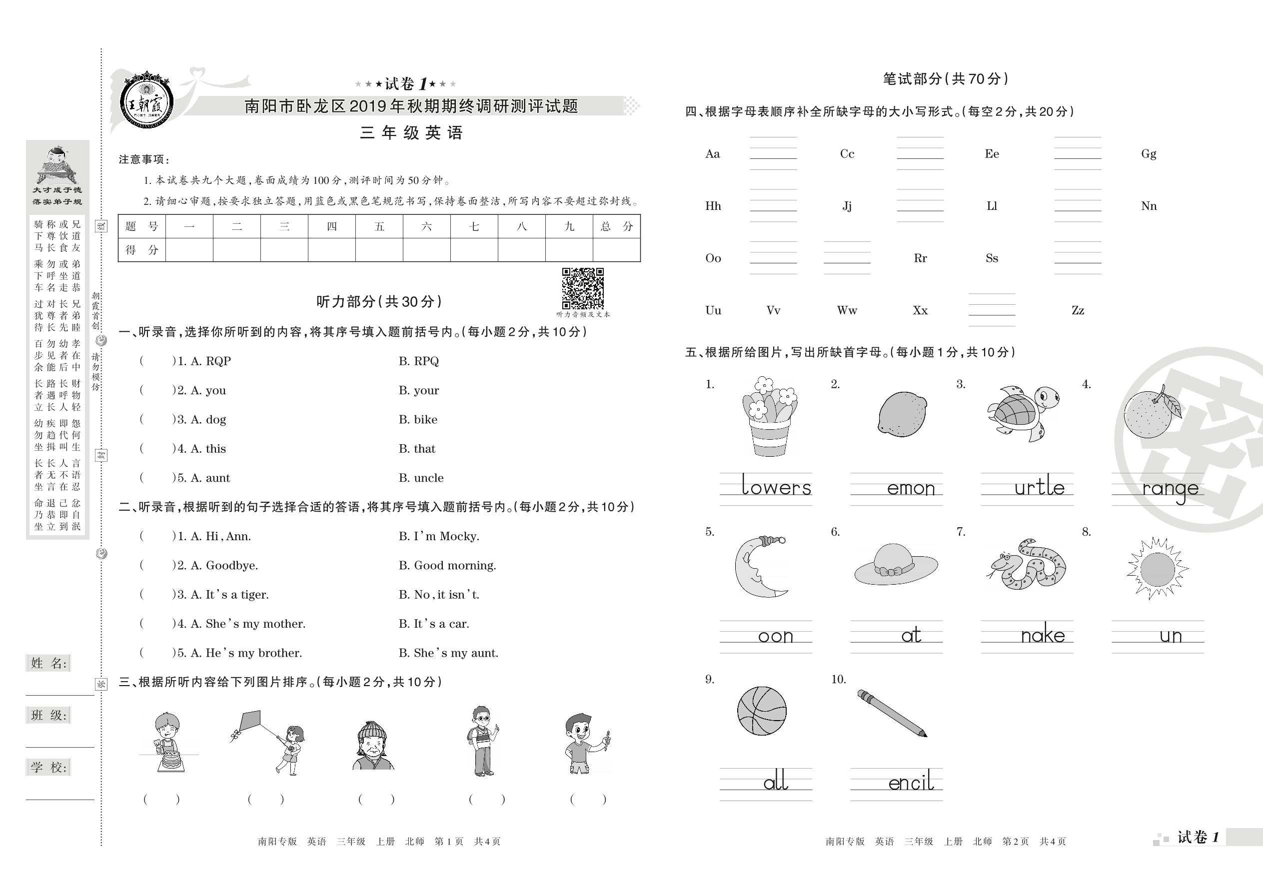 2019-2020学年第一学期南阳市卧龙区三年级英语试卷(北师版)【1】