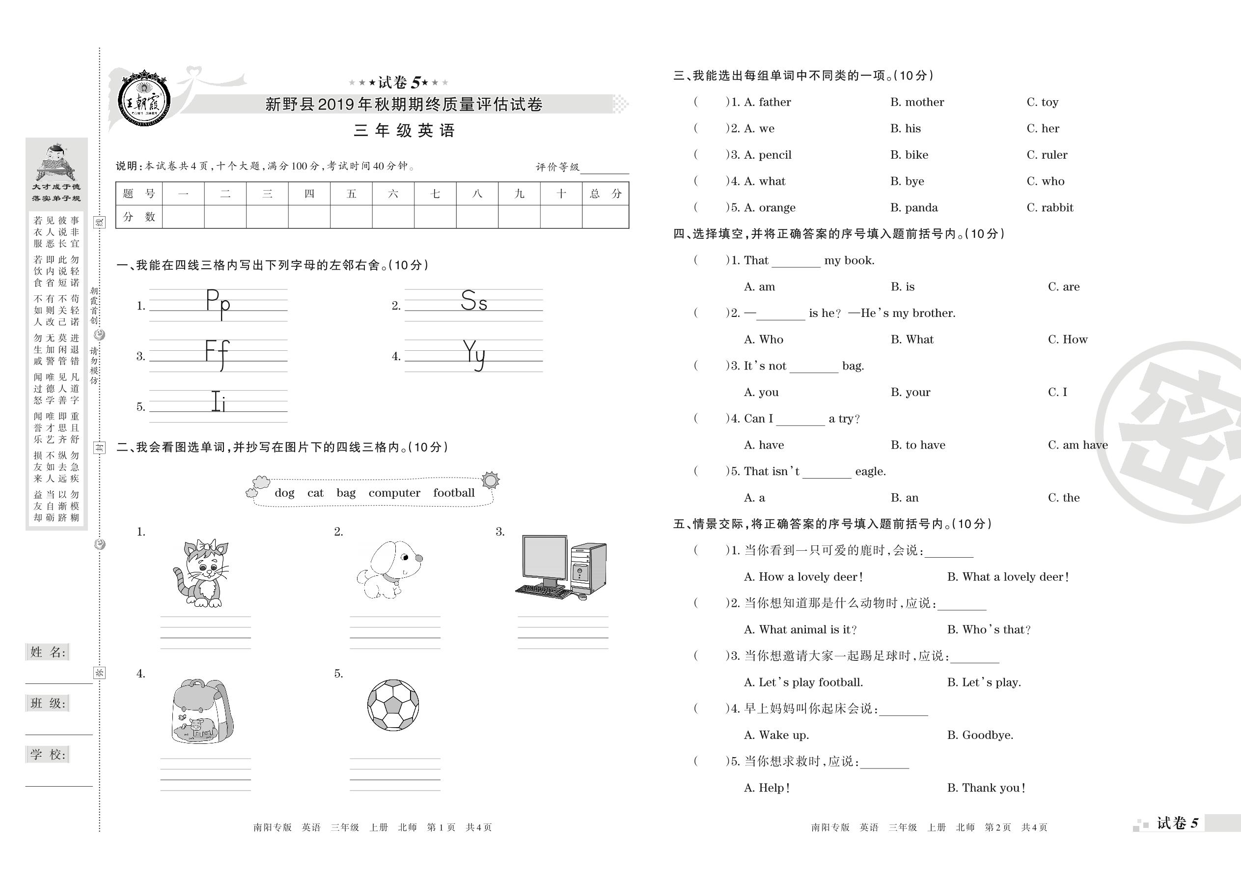 2019-2020学年第一学期南阳市新野县三年级英语试卷(北师版)【5】