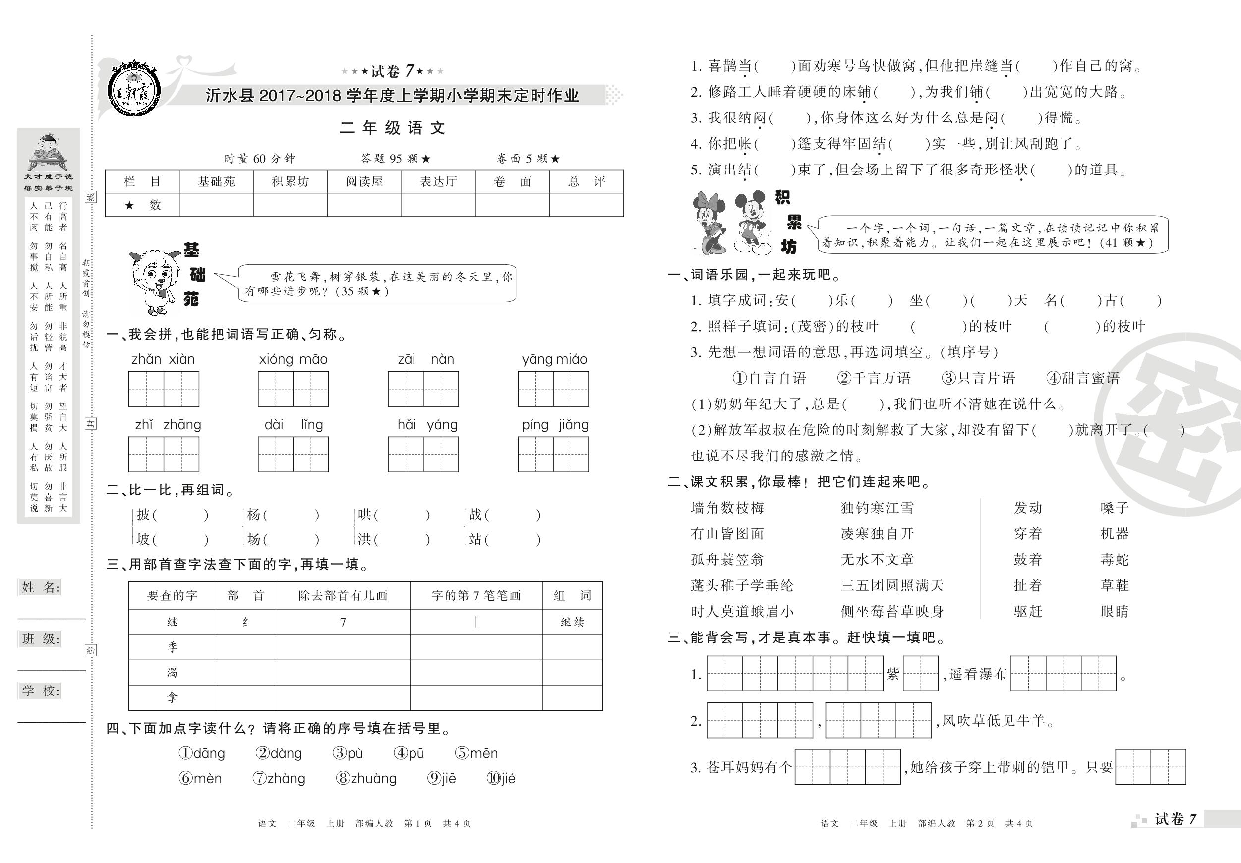 2017-2018学年第一学期临沂市沂水县二年级语文试卷(人教版)【7】