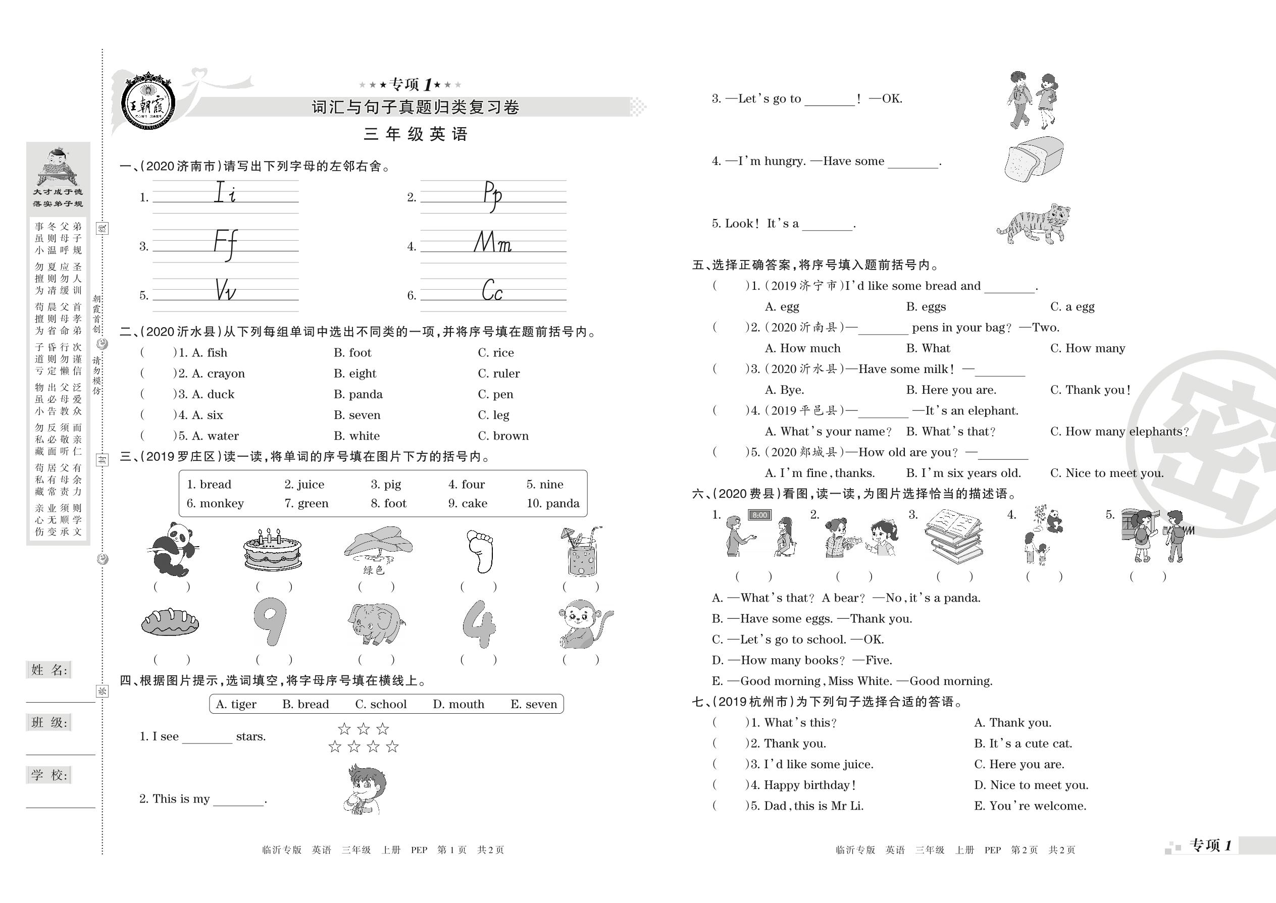 王朝霞期末专项卷——词汇与句子、情景交际真题归类复习三年级上册英语(PEP版)【0】