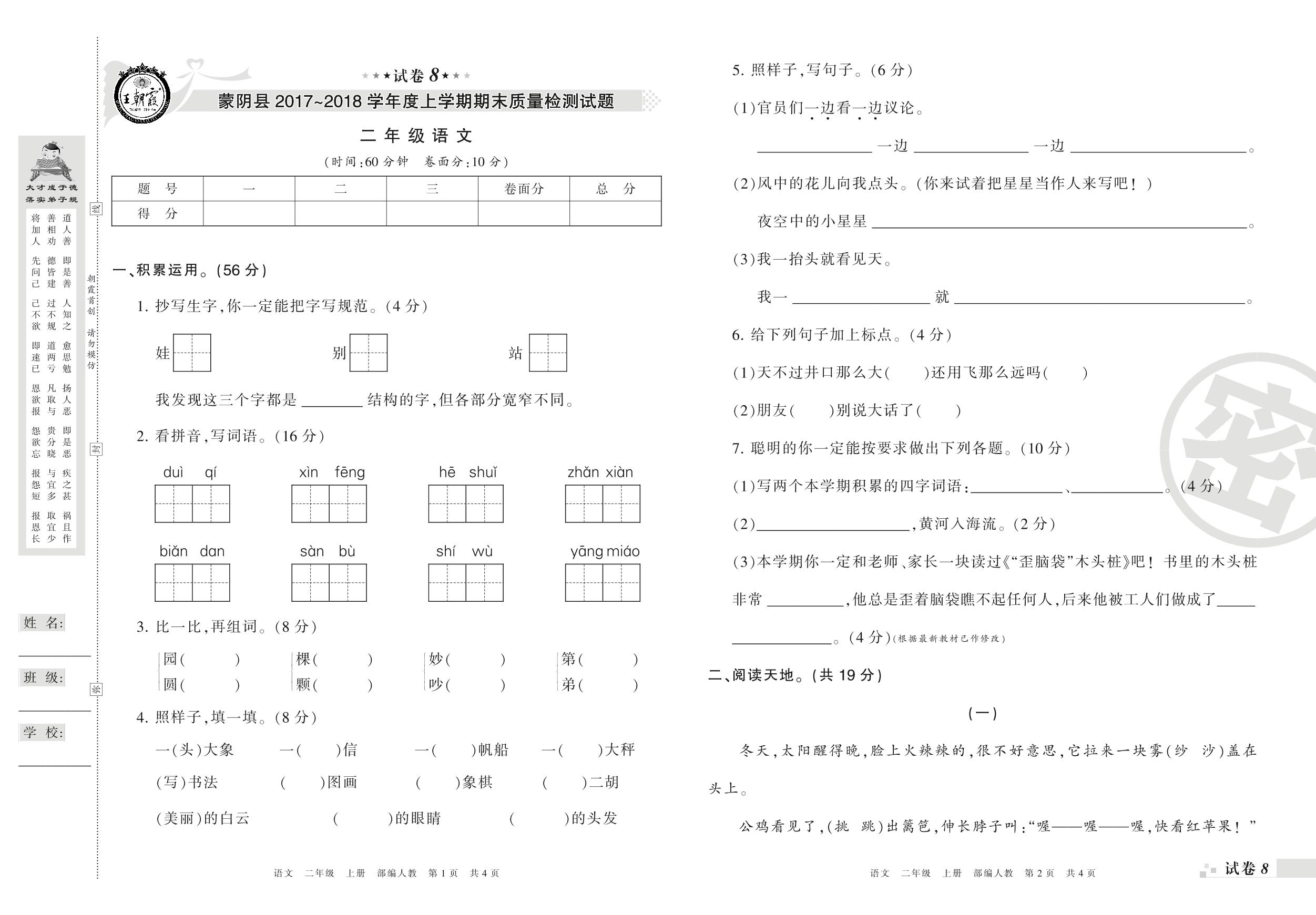 2017-2018学年第一学期临沂市蒙阴县二年级语文试卷(人教版)【8】