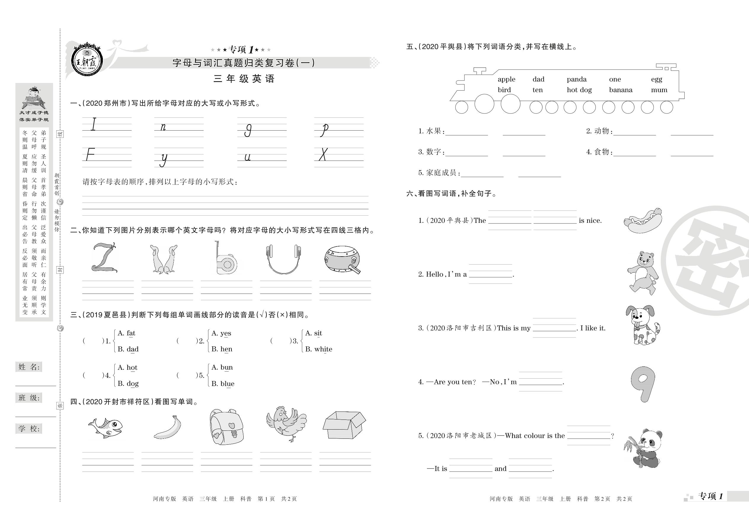 王朝霞期末专项卷——字母与词汇真题归类复习三年级上册英语(科普版)【0】