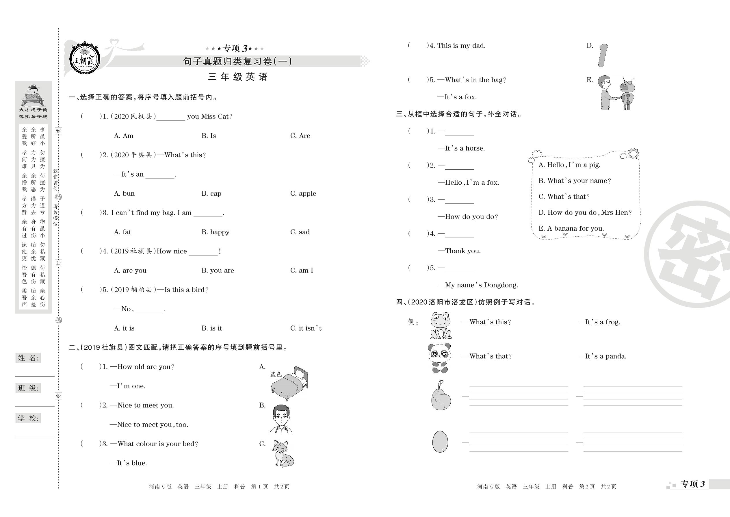 王朝霞期末专项卷——句子真题归类复习三年级上册英语(科普版)【0】