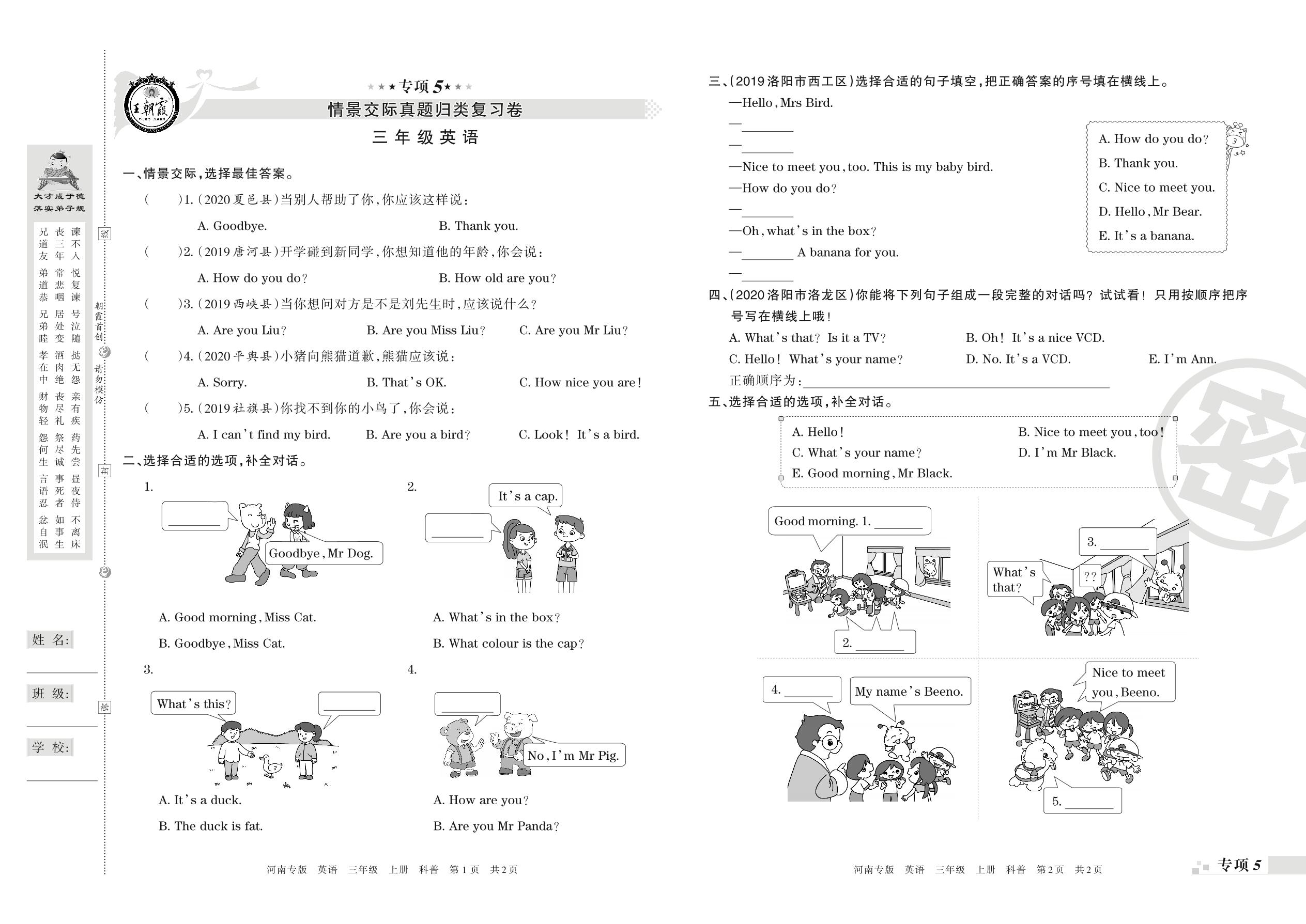 王朝霞期末专项卷——情景交际真题归类复习、绘本阅读三年级上册英语(科普版)【0】
