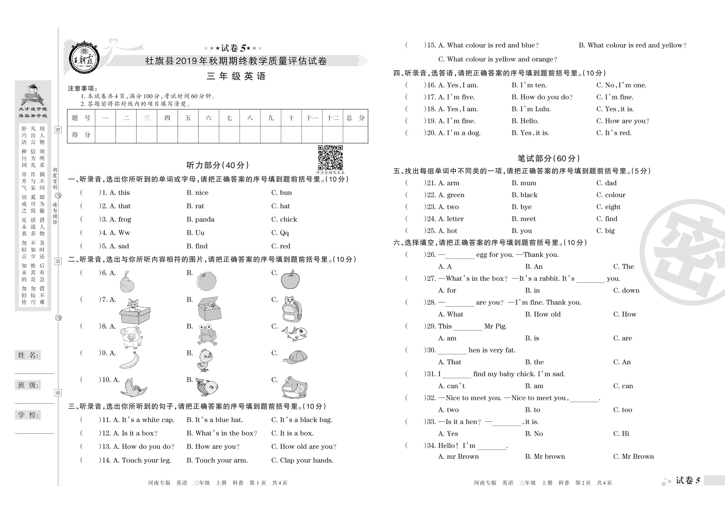 2019-2020学年第一学期南阳市社旗县三年级英语试卷(科普版)【5】