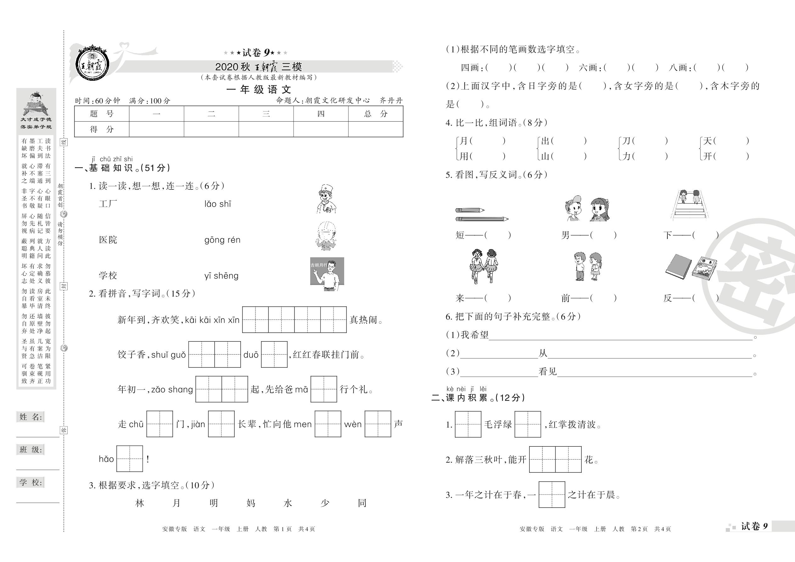 王朝霞期末模拟卷一年级上册语文(人教版)_R210731174706【9】