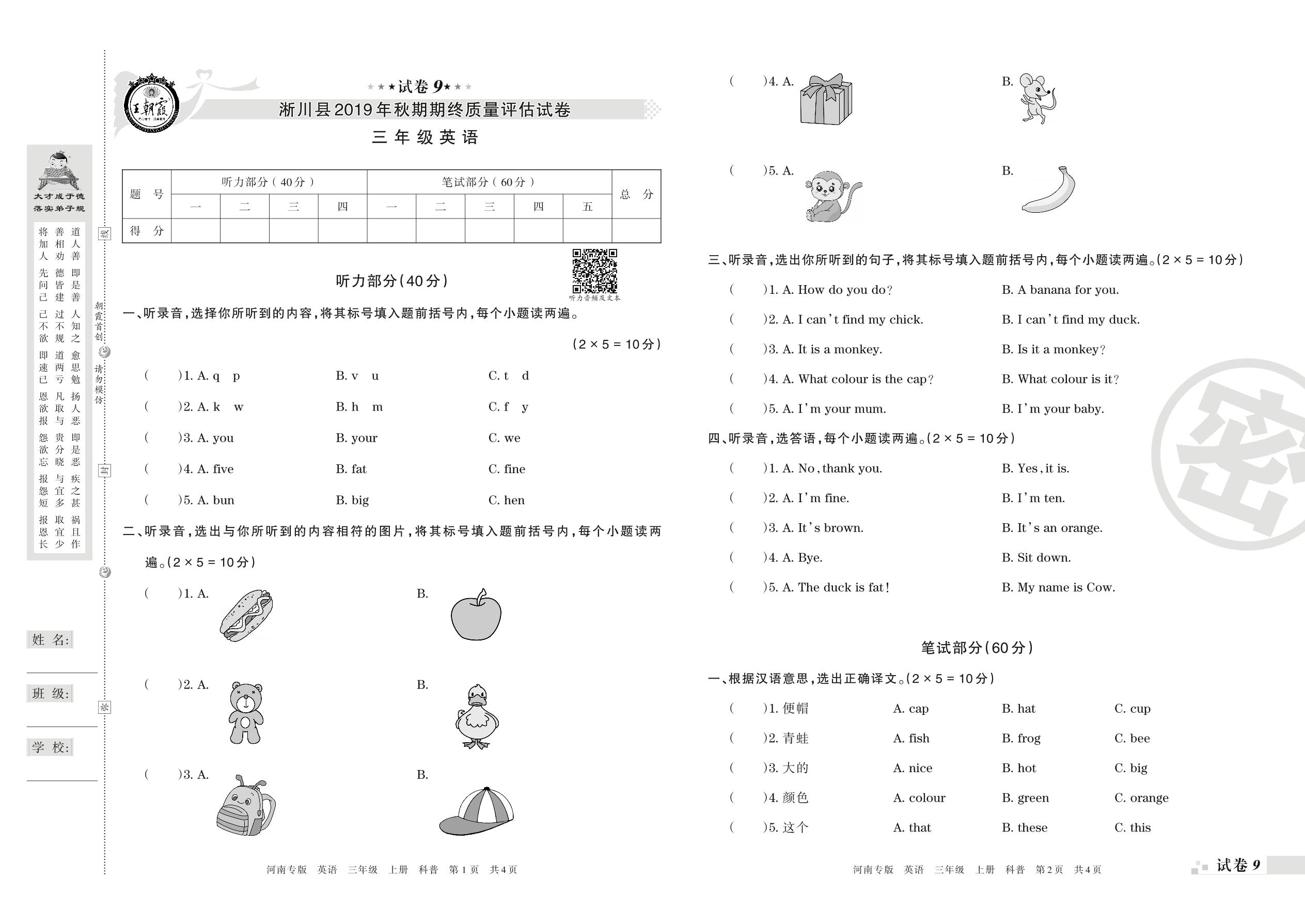 2019-2020学年第一学期南阳市淅川县三年级英语试卷(科普版)【9】