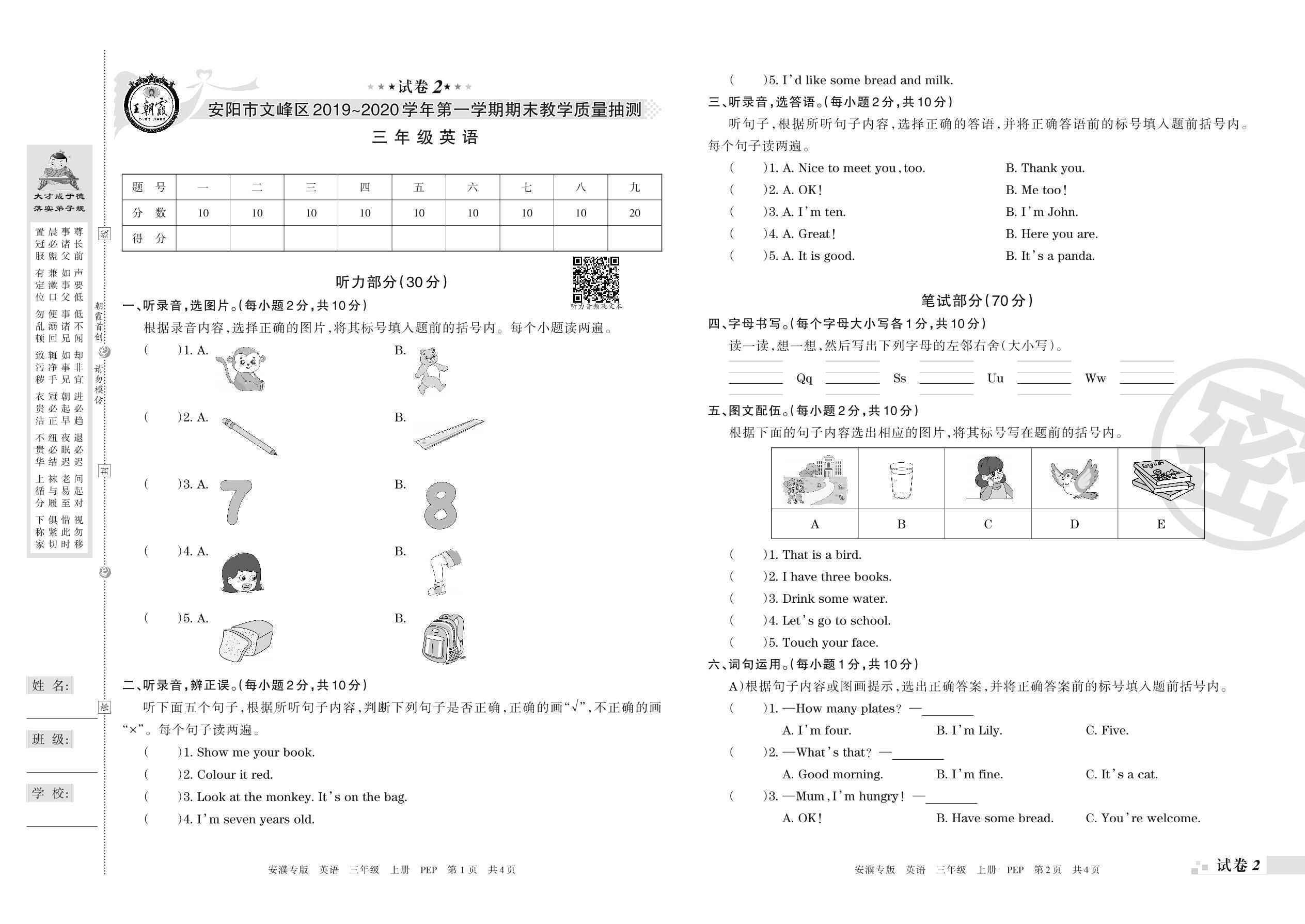 2019-2020学年第一学期安阳市文峰区三年级英语试卷(PEP版)【2】