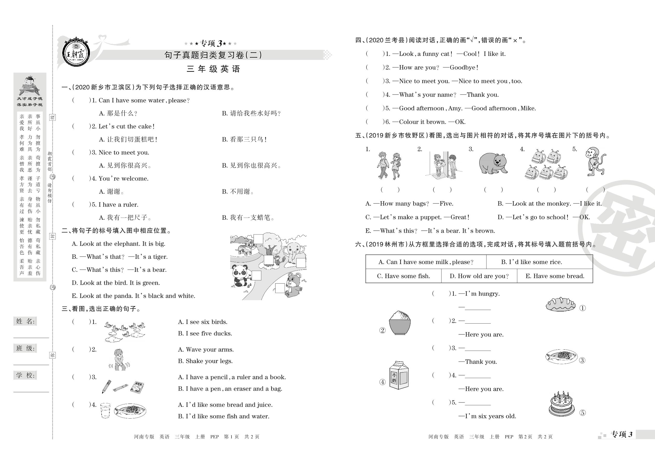 王朝霞期末专项卷——句子、情景交际真题归类复习三年级上册英语(PEP版)【0】