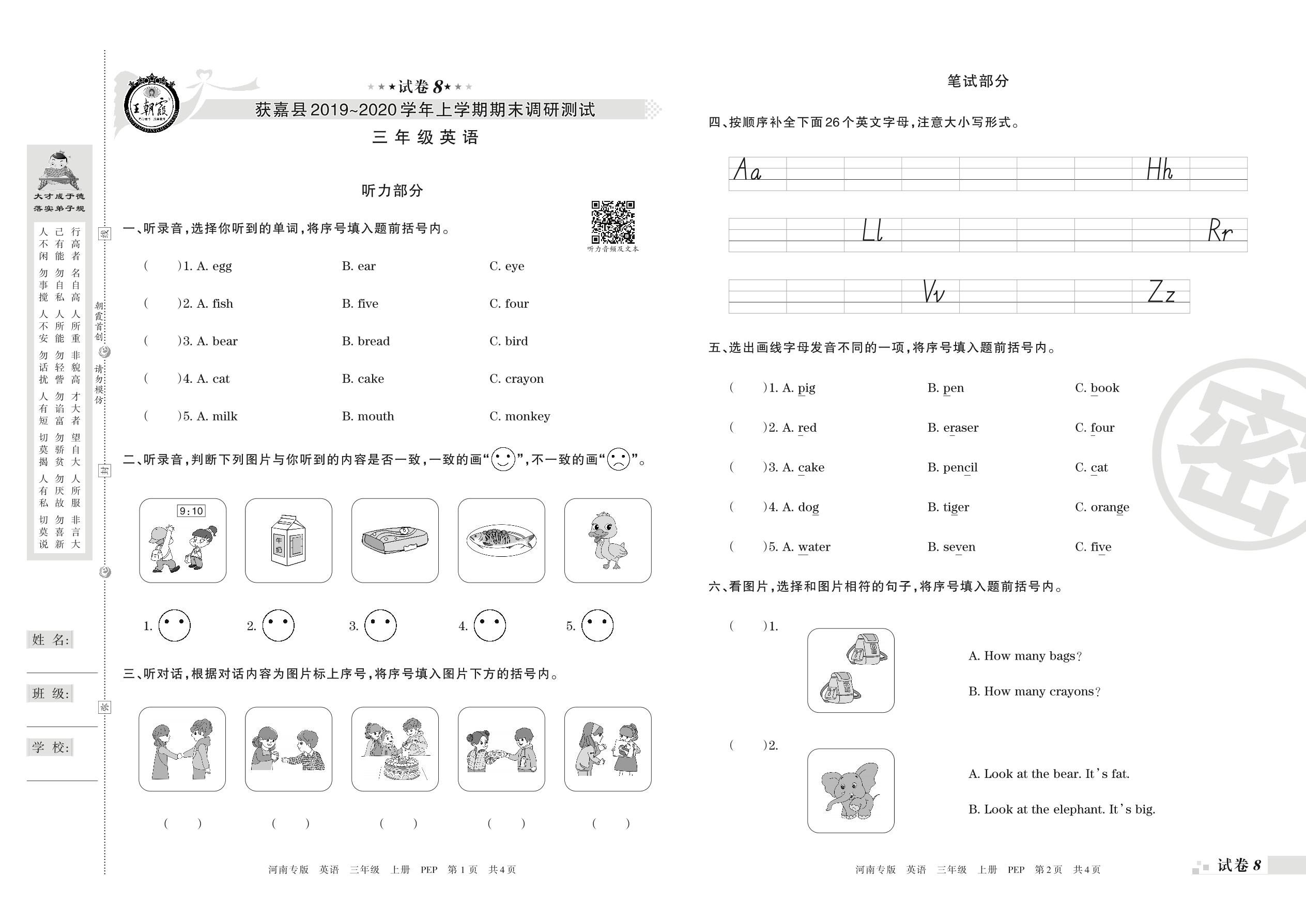 2019-2020学年第一学期新乡市获嘉县三年级英语试卷(PEP版)【8】