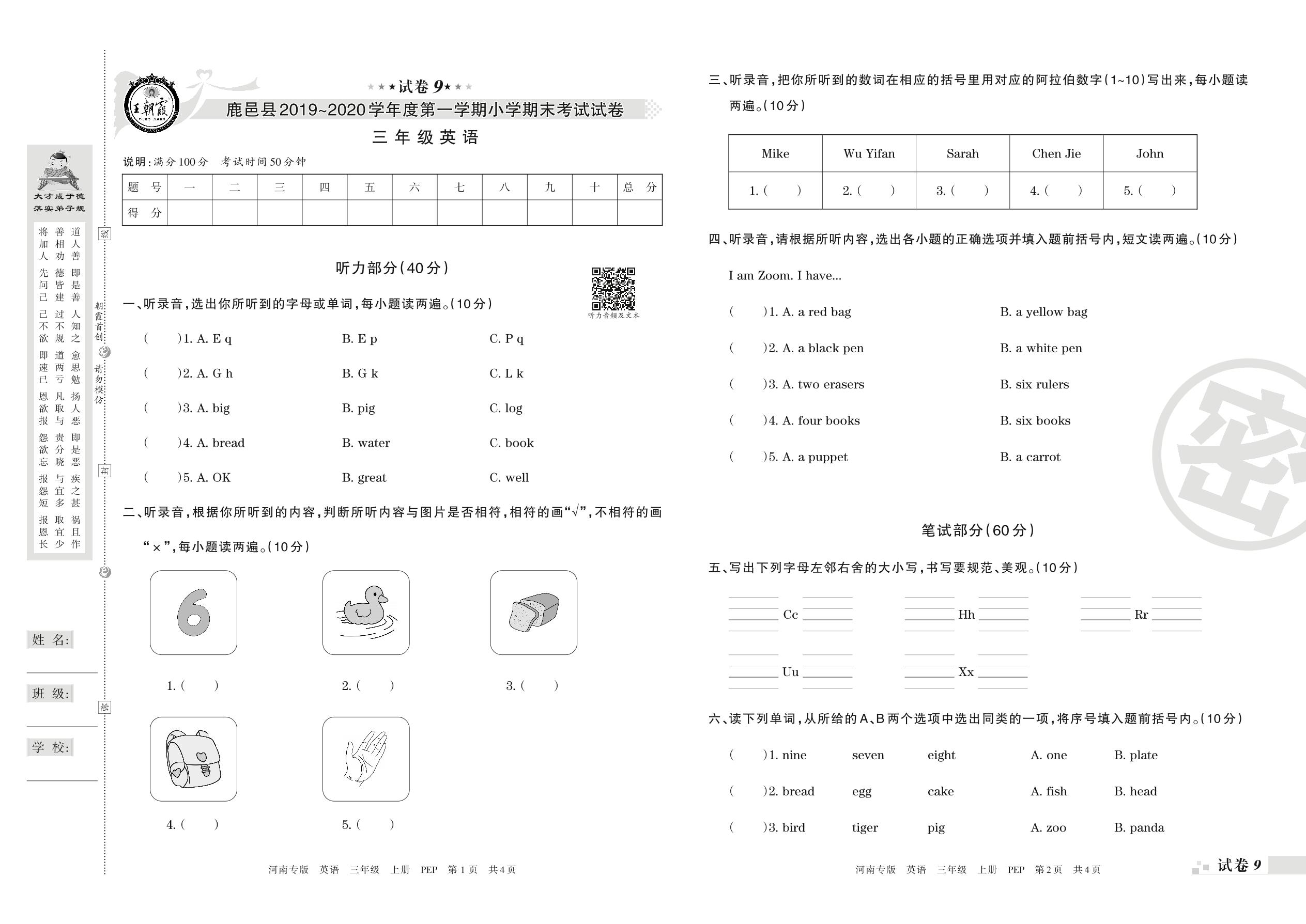 2019-2020学年第一学期周口市鹿邑县三年级英语试卷(PEP版)【9】