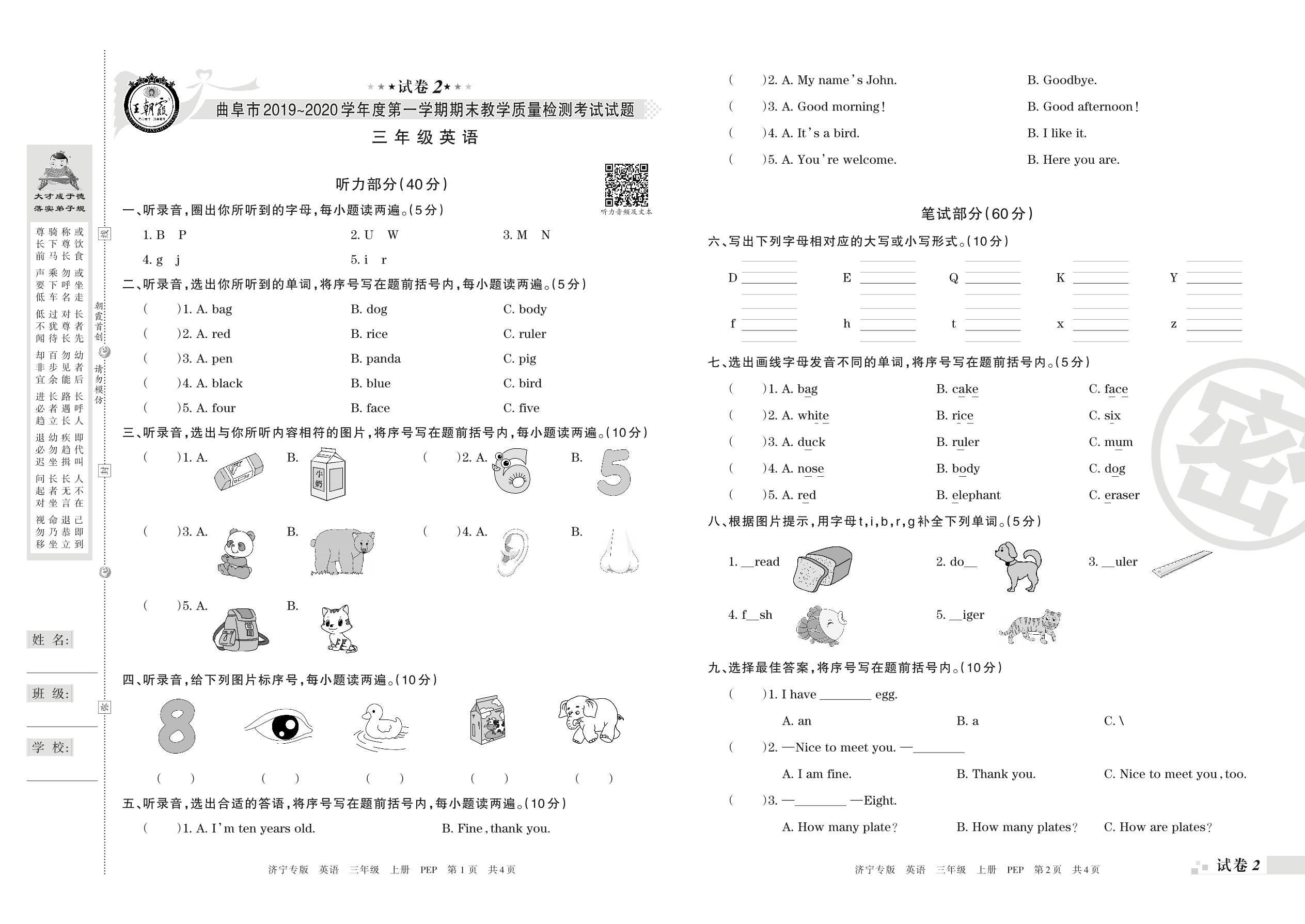 2019-2020学年第一学期曲阜市三年级英语试卷(PEP版)【2】