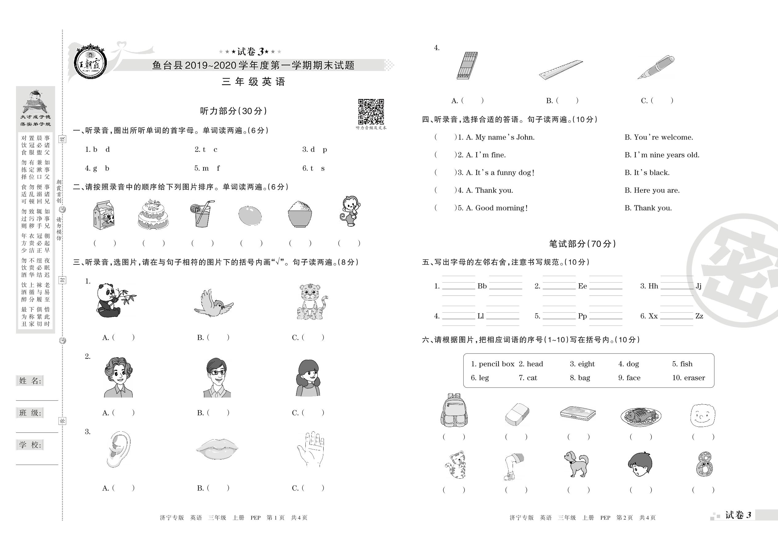 2019-2020学年第一学期济宁市鱼台县三年级英语试卷(PEP版)【3】