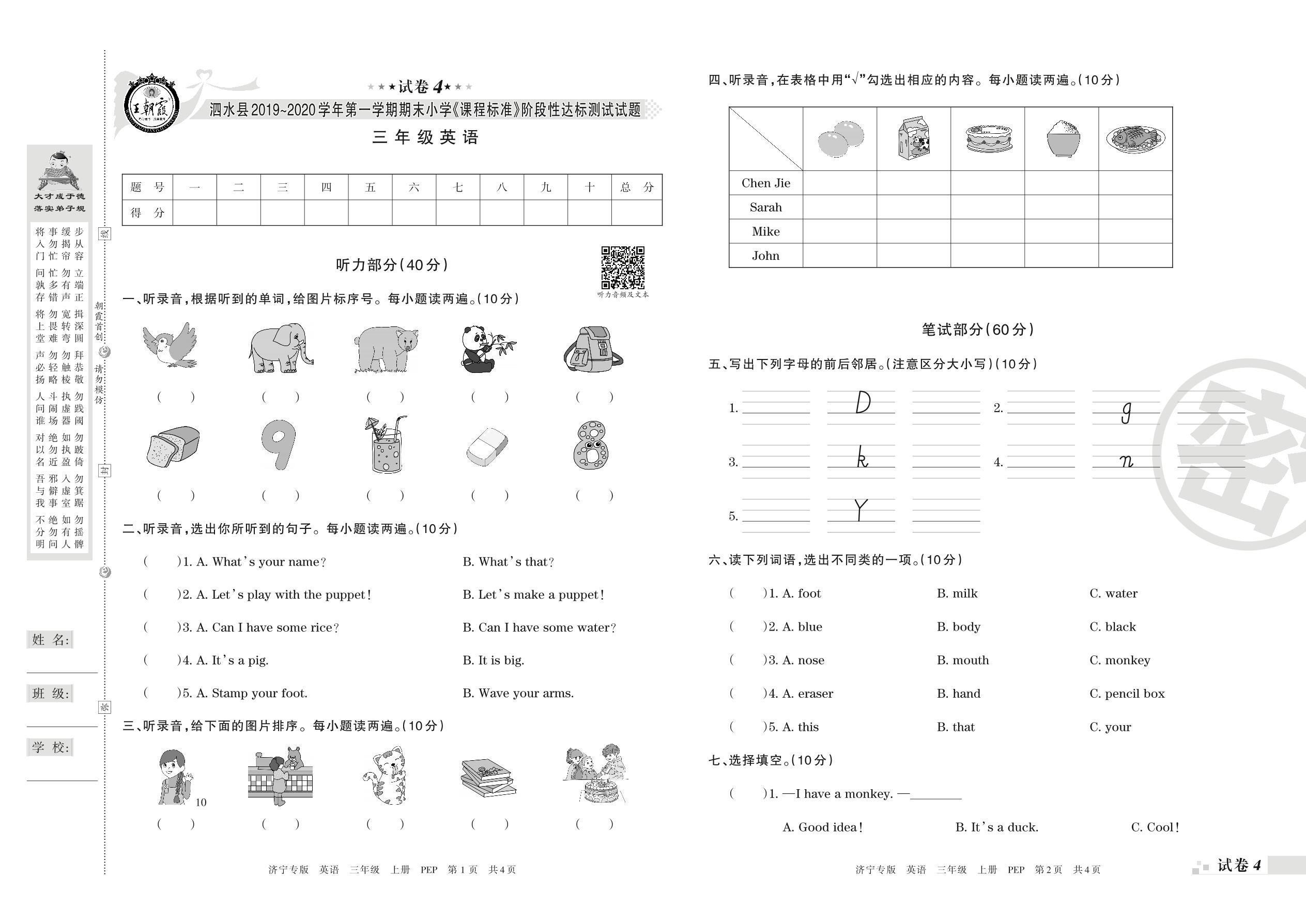 2019-2020学年第一学期济宁市泗水县三年级英语试卷(PEP版)【4】
