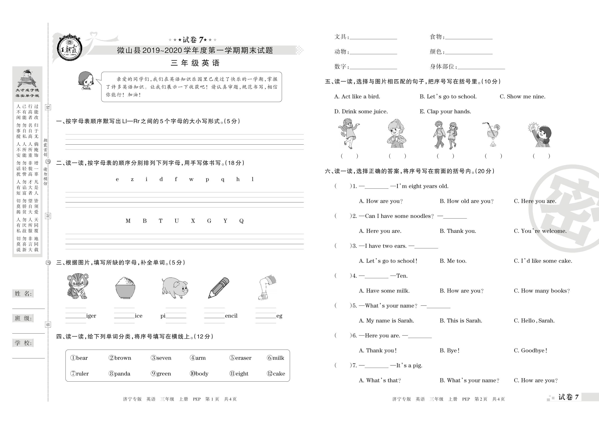 2019-2020学年第一学期济宁市微山县三年级英语试卷(PEP版)【7】