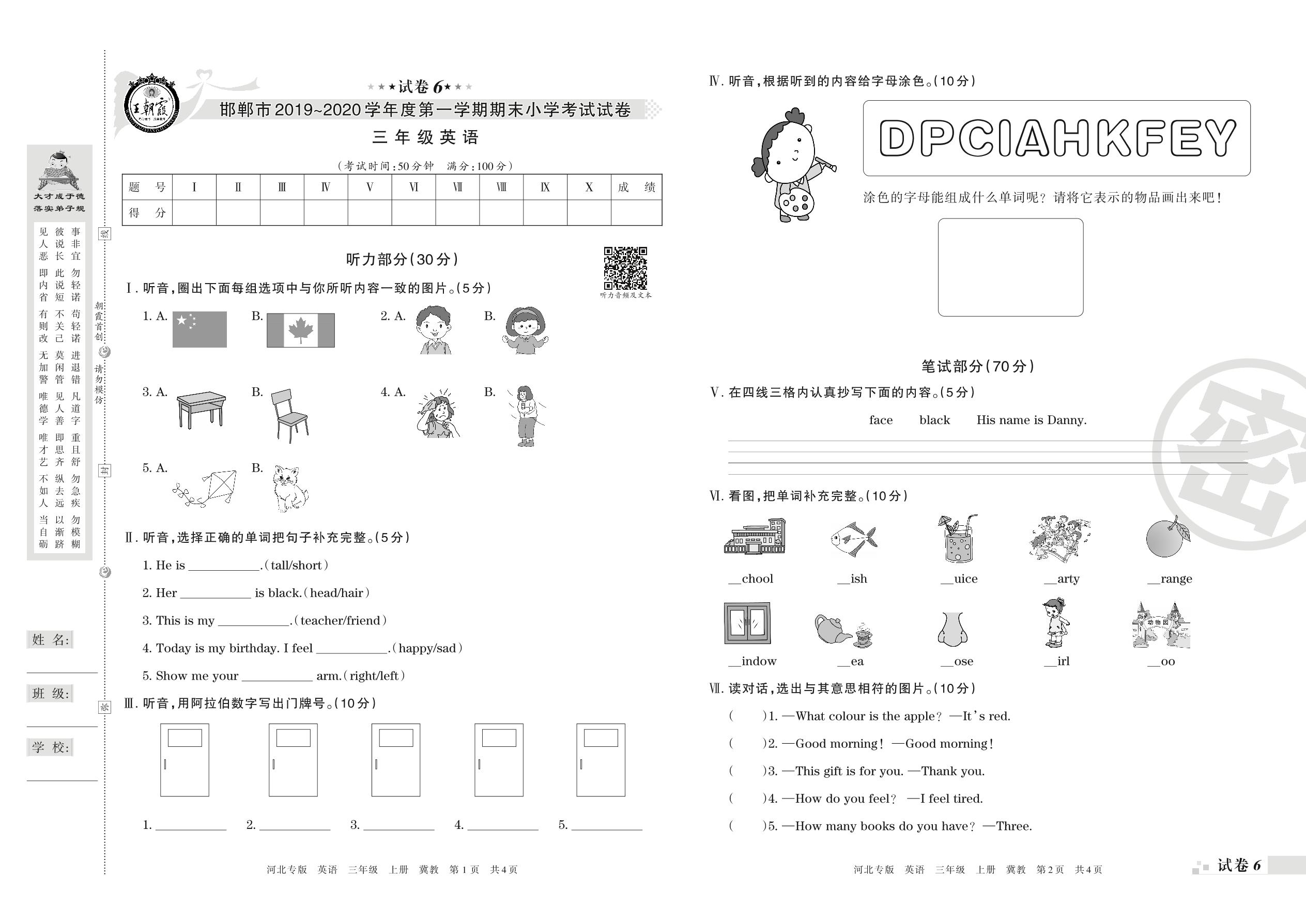 2019-2020学年第一学期邯郸市三年级英语试卷(冀教版)【6】