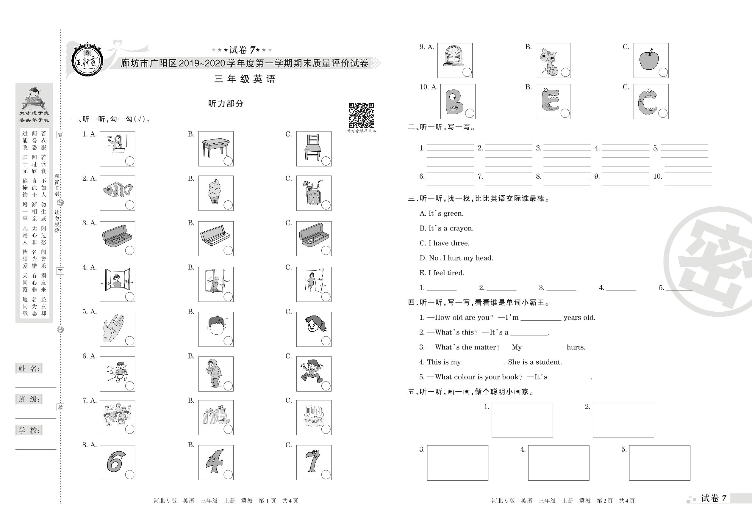 2019-2020学年第一学期廊坊市广阳区三年级英语试卷(冀教版)【7】