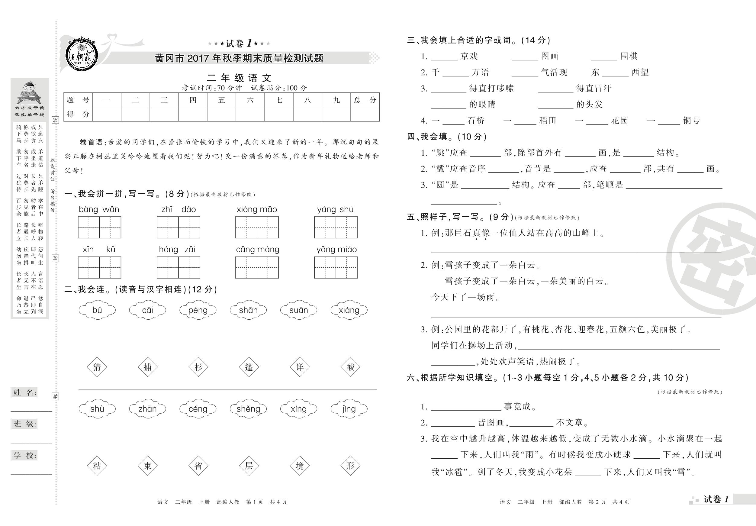 2017-2018学年第一学期黄冈市二年级语文试卷(人教版)【1】