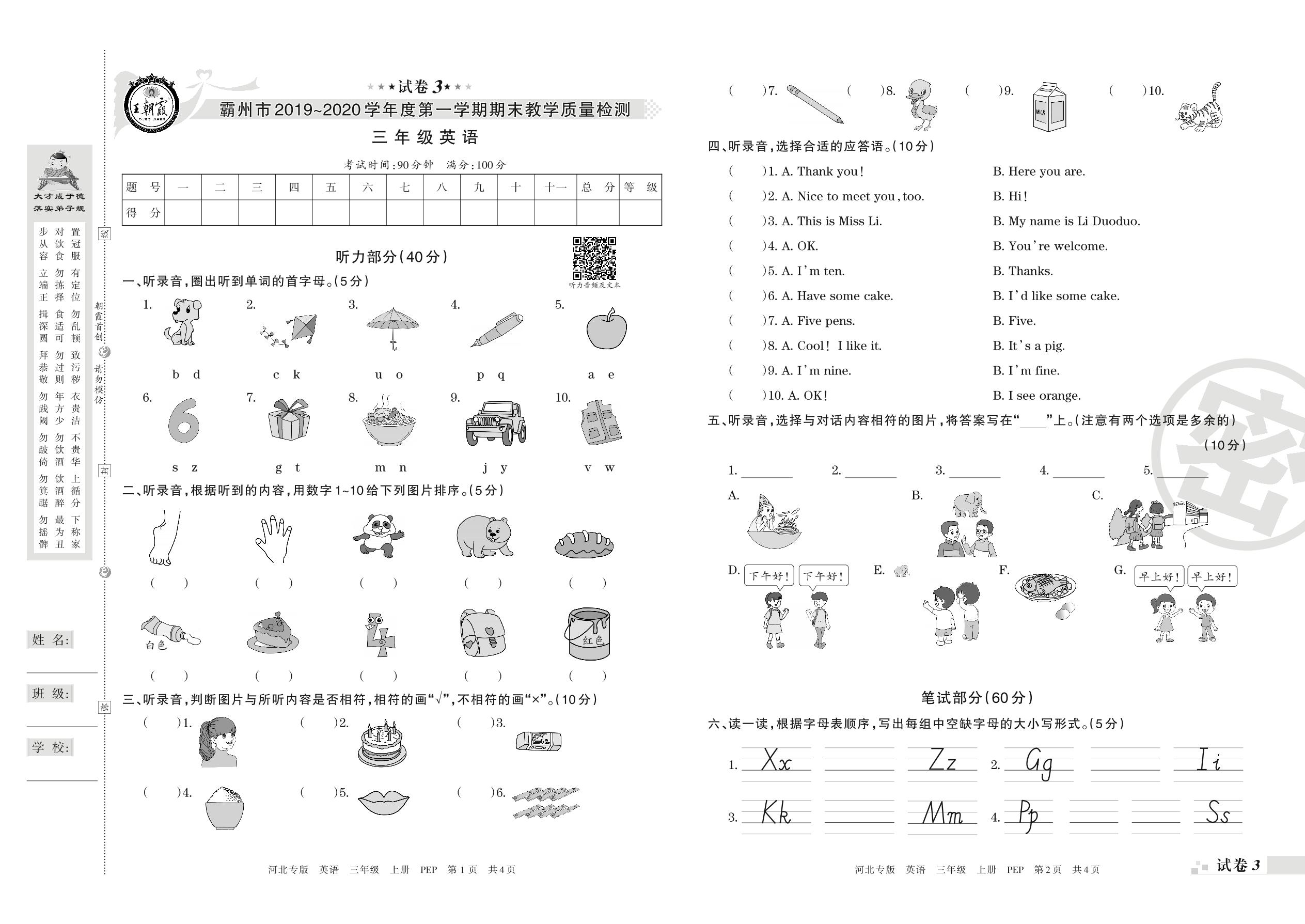 2019-2020学年第一学期霸州市三年级英语试卷(PEP版)【3】
