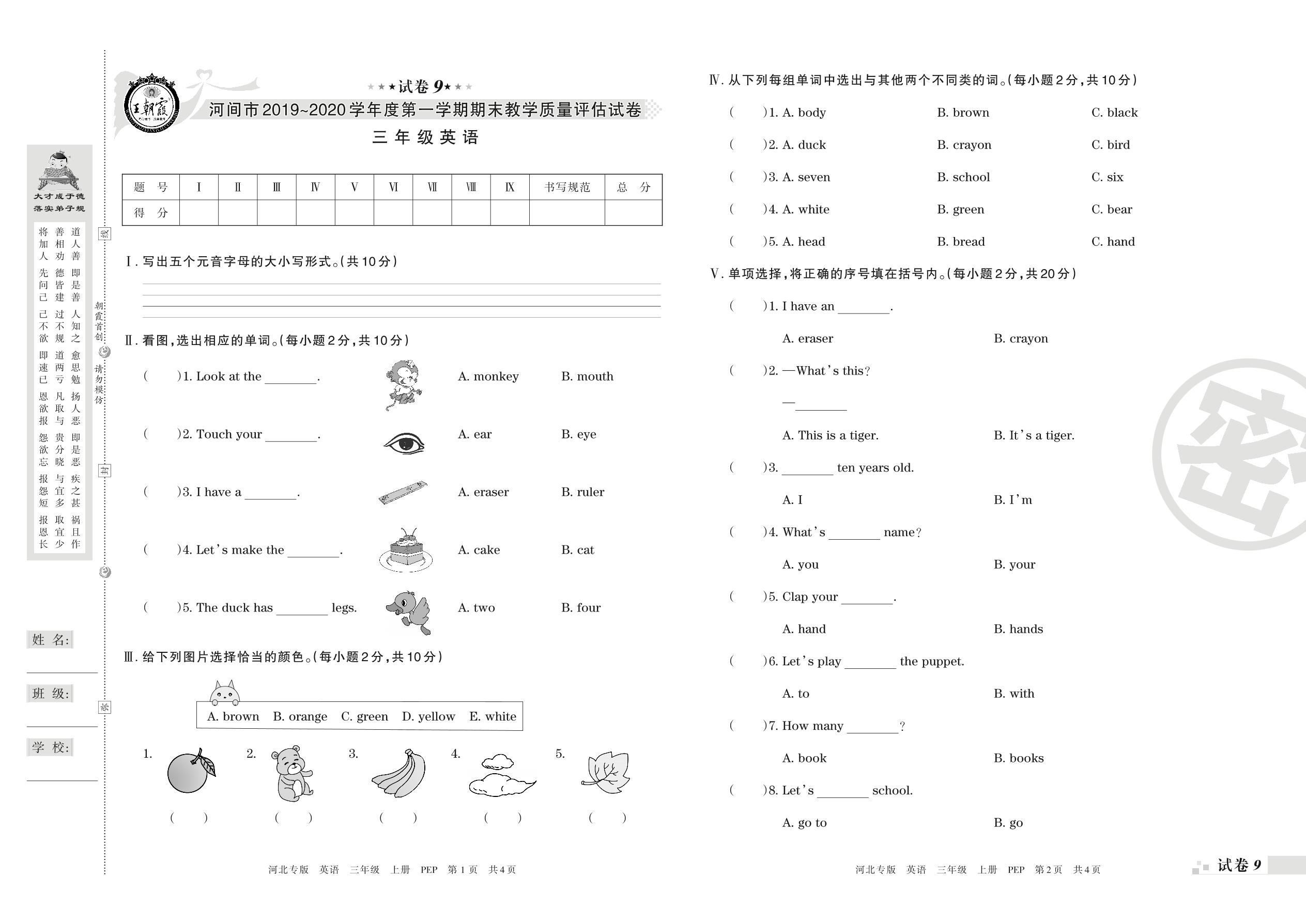 2019-2020学年第一学期河间市三年级英语试卷(PEP版)【9】