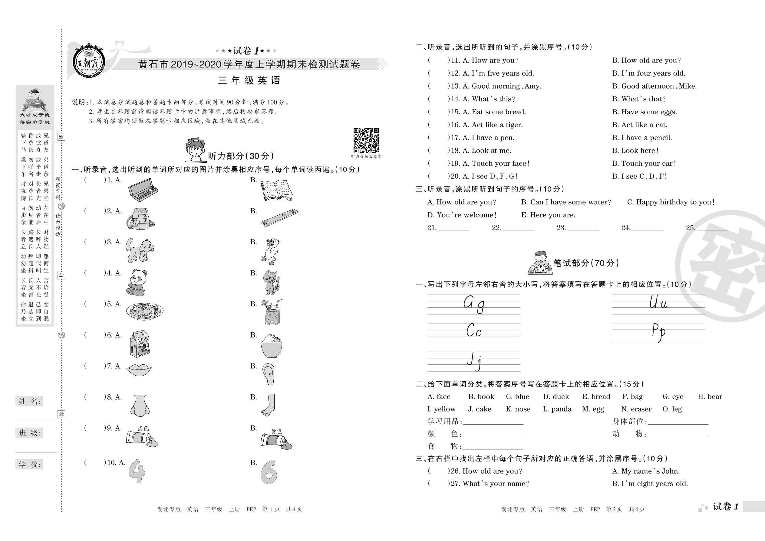 2019-2020学年第一学期黄石市三年级英语试卷(PEP版)【1】