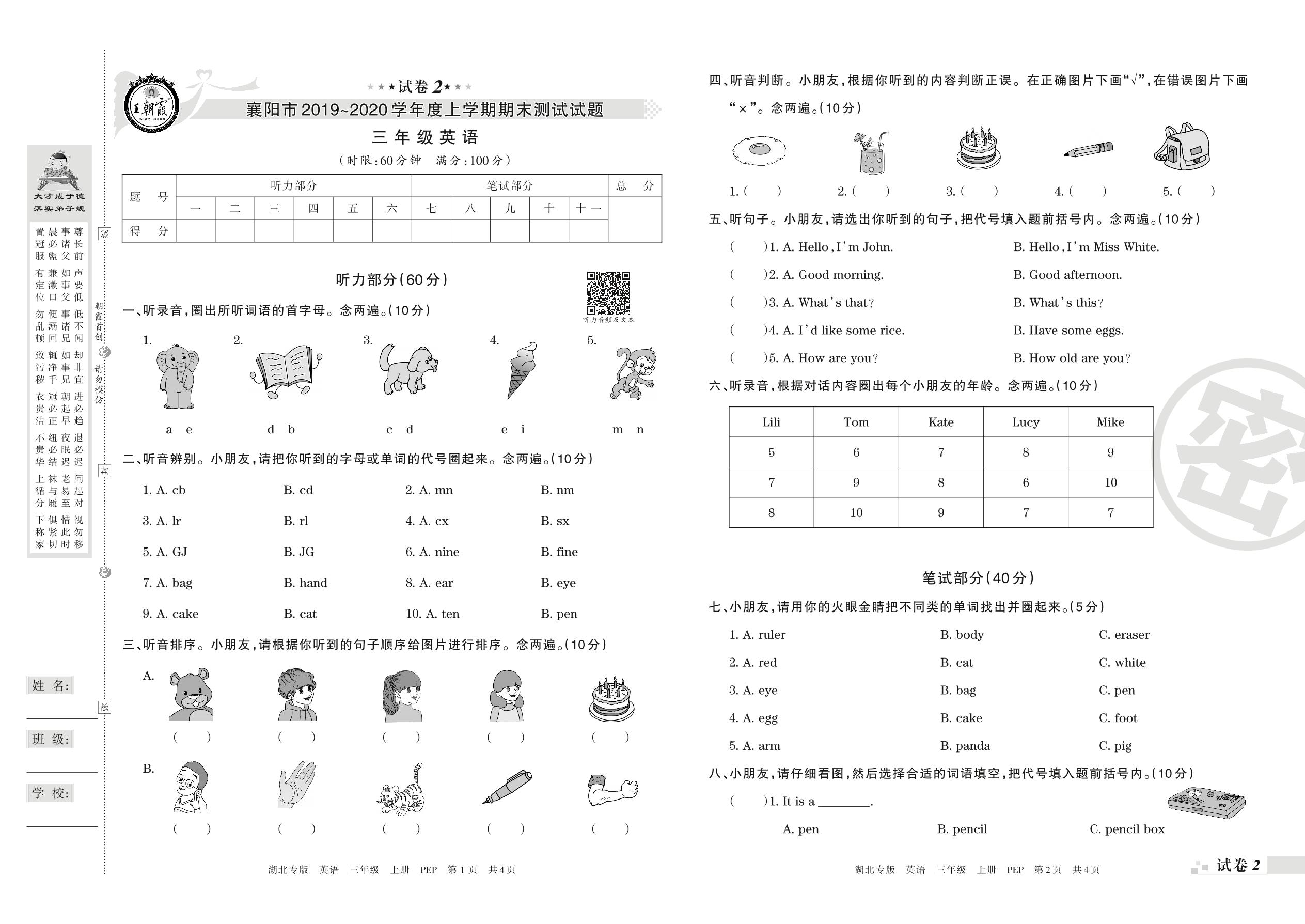 2019-2020学年第一学期襄阳市三年级英语试卷(PEP版)【2】
