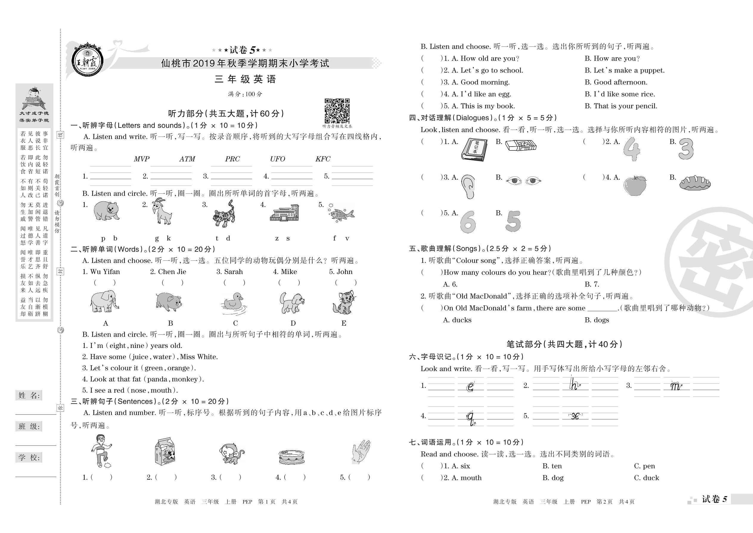 2019-2020学年第一学期仙桃市三年级英语试卷(PEP版)【5】