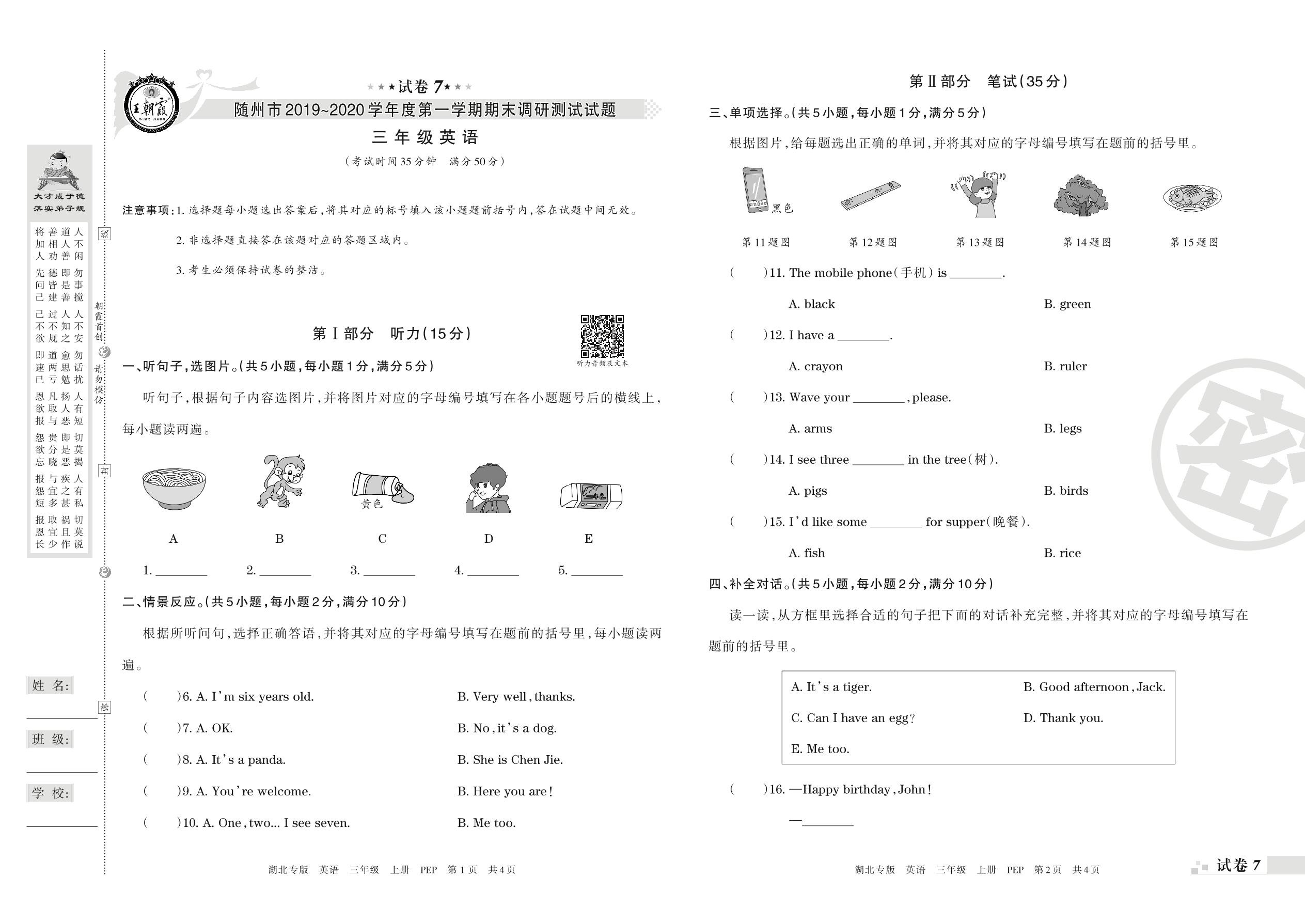 2019-2020学年第一学期随州市三年级英语试卷(PEP版)【7】