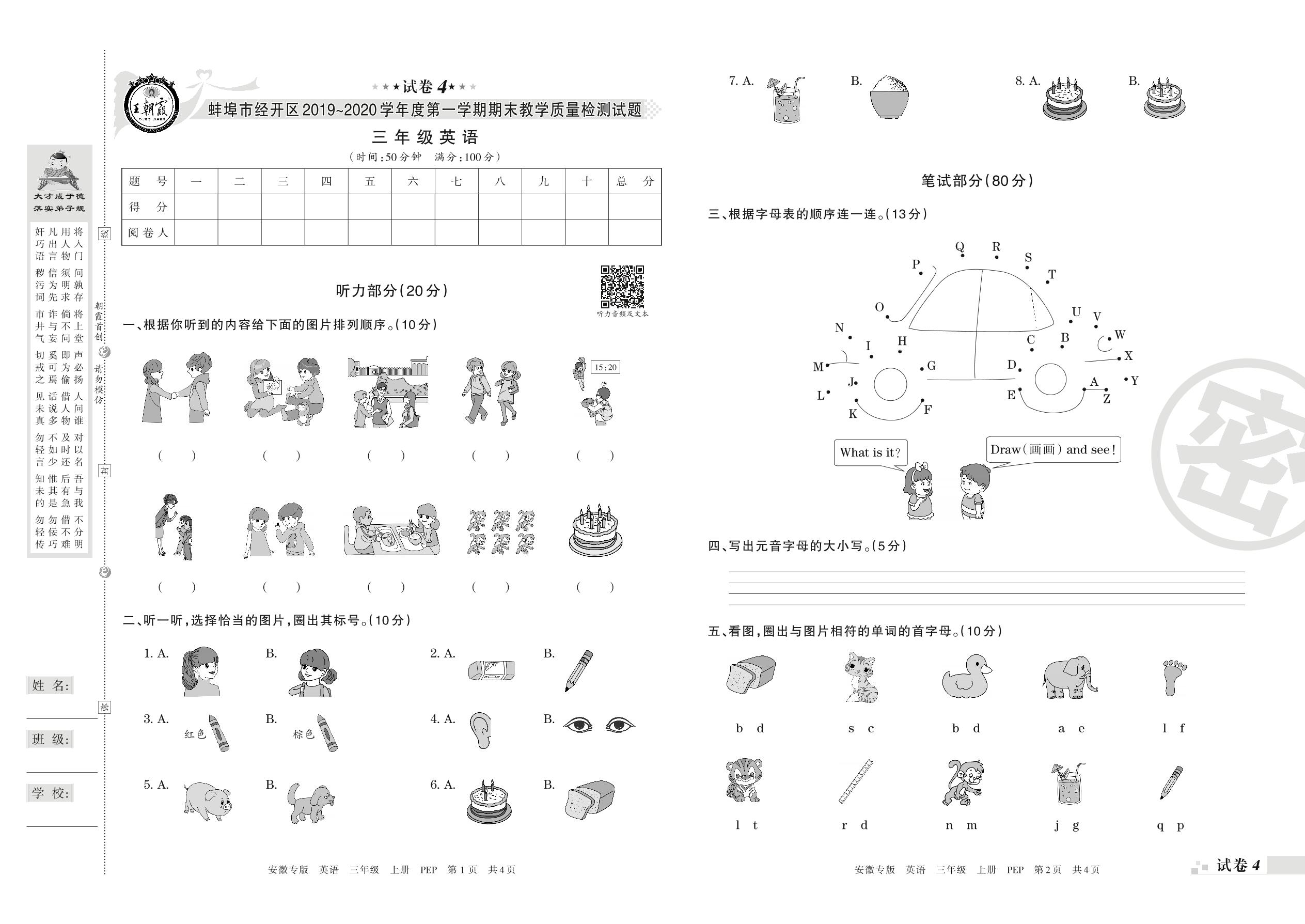 2019-2020学年第一学期蚌埠市经开区三年级英语试卷(PEP版)【4】