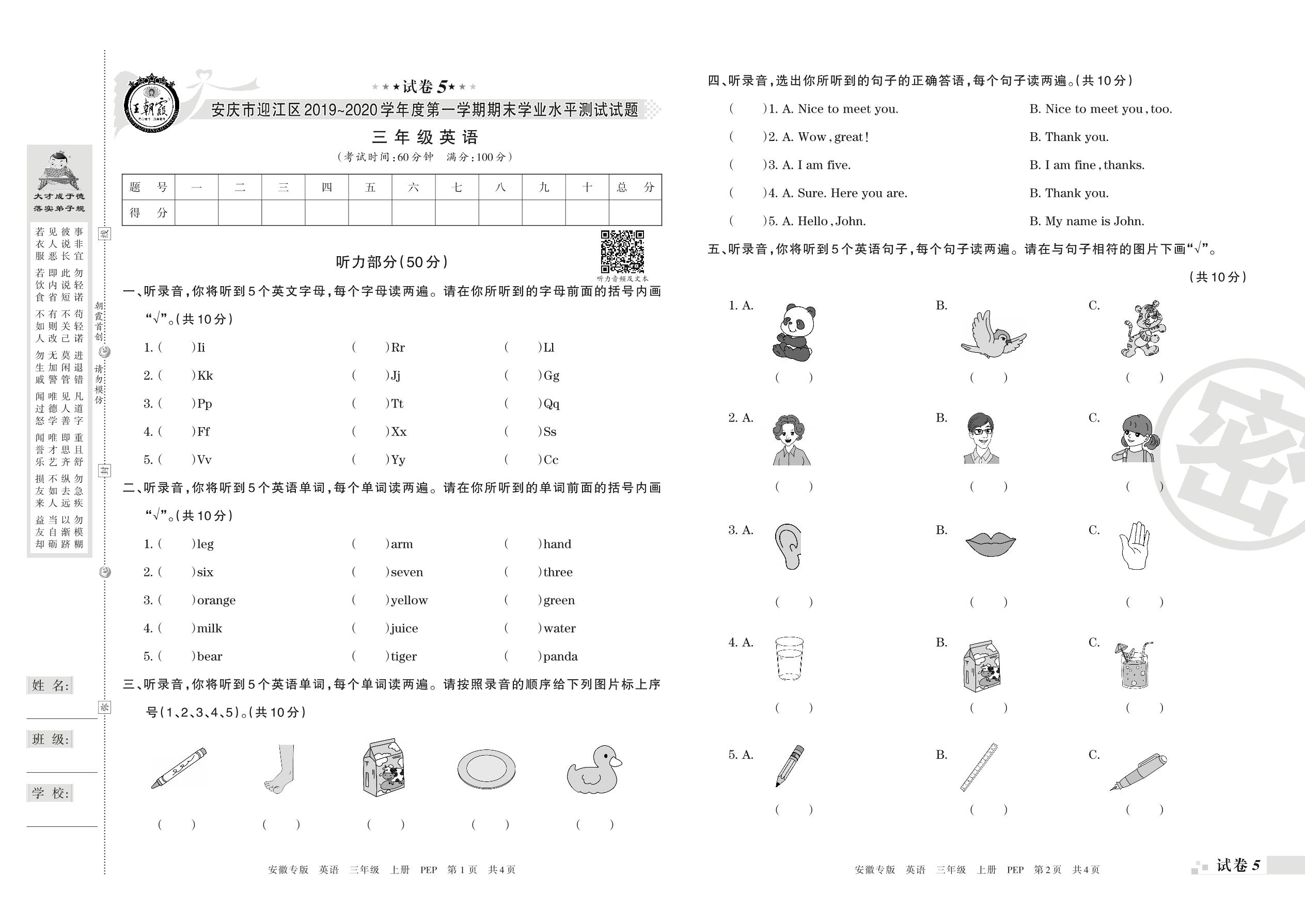 2019-2020学年第一学期安庆市迎江区三年级英语试卷(PEP版)【5】