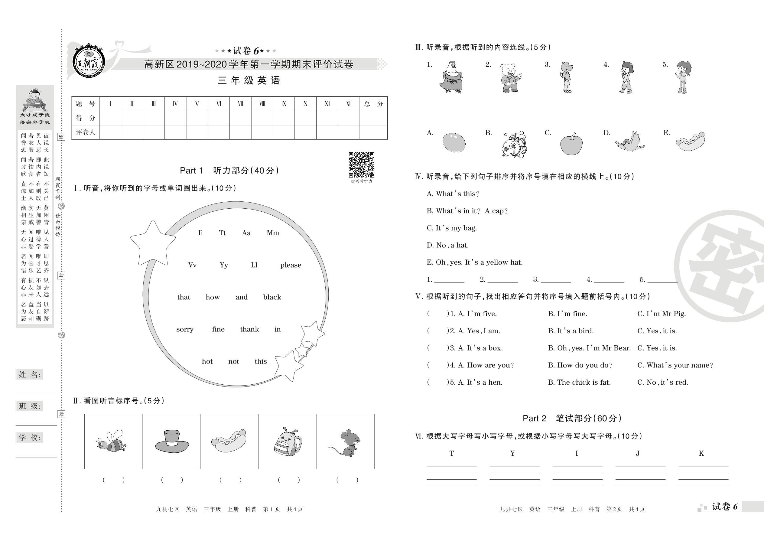 2019-2020学年第一学期洛阳市高新区三年级英语试卷(科普版)【6】