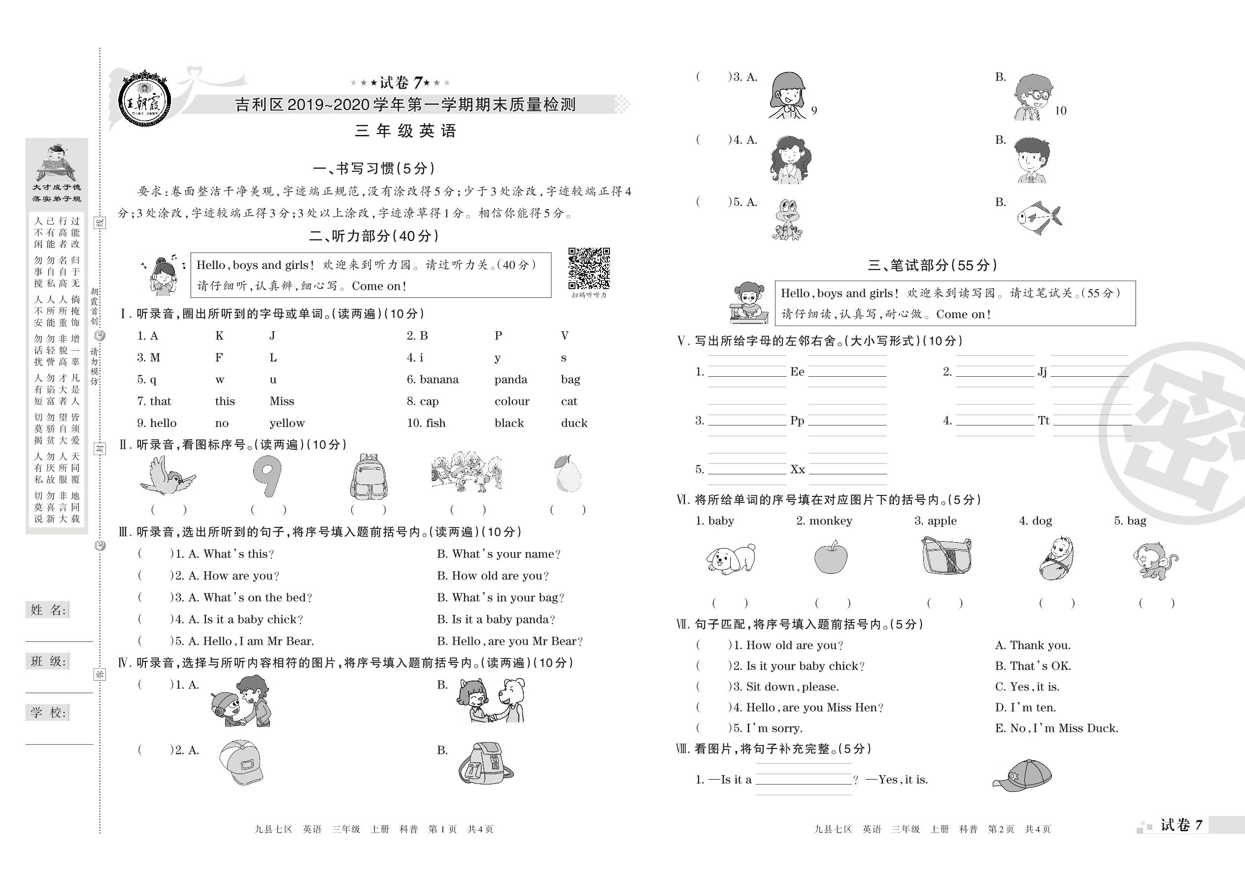 2019-2020学年第一学期洛阳市吉利区三年级英语试卷(科普版)【7】