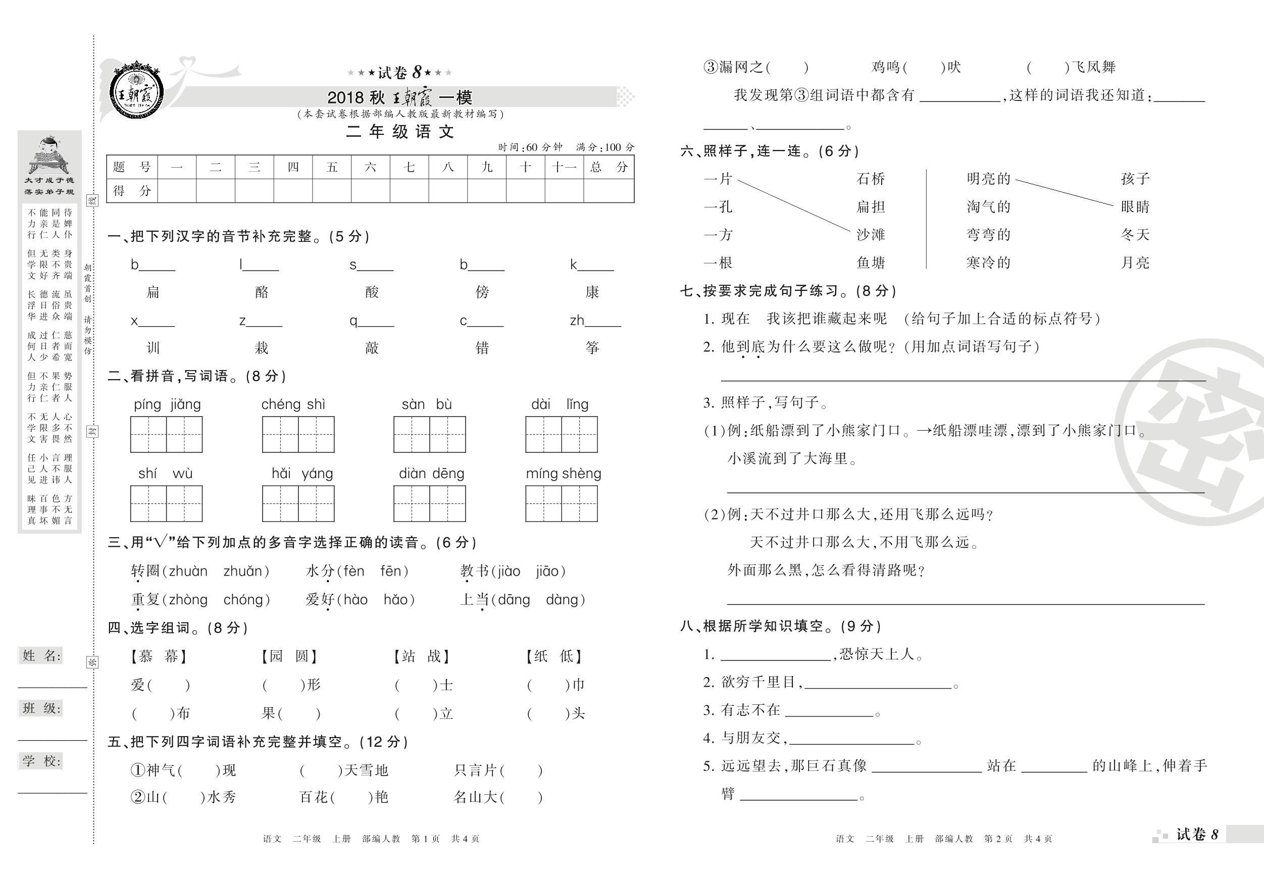 王朝霞期末模拟卷二年级上册语文(人教版)_R21080180243【8】