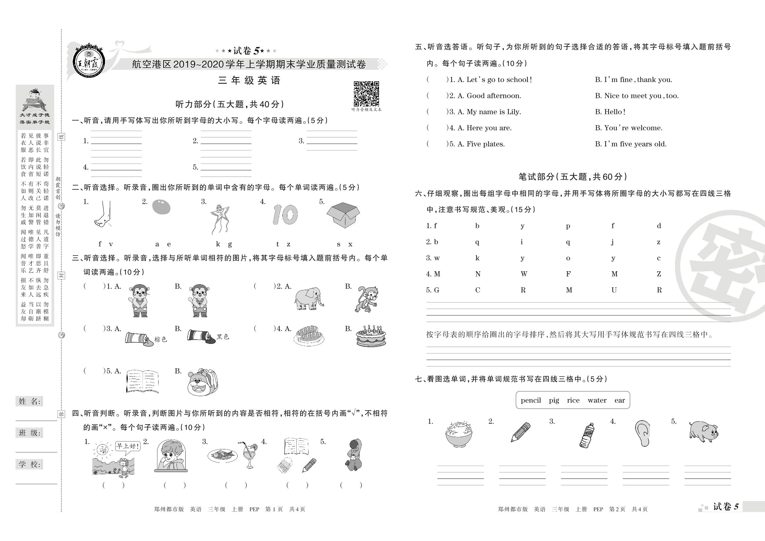 2019-2020学年第一学期郑州市航空港区三年级英语试卷(PEP版)【5】