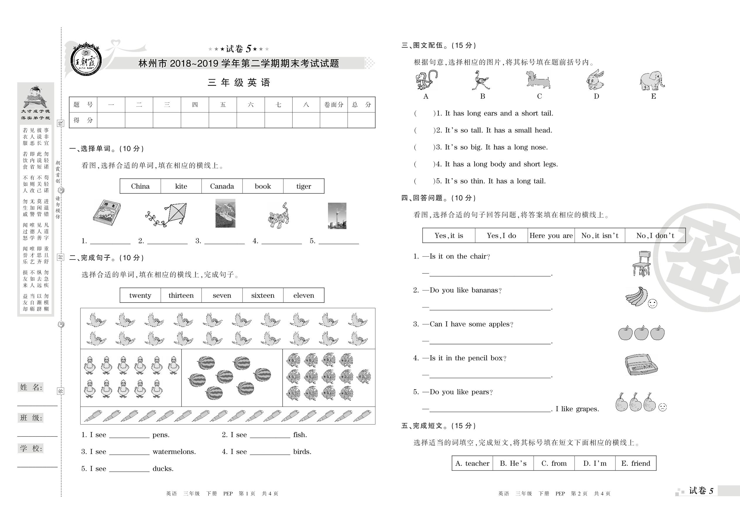 2018-2019学年第二学期林州市三年级英语试卷(PEP版)【5】