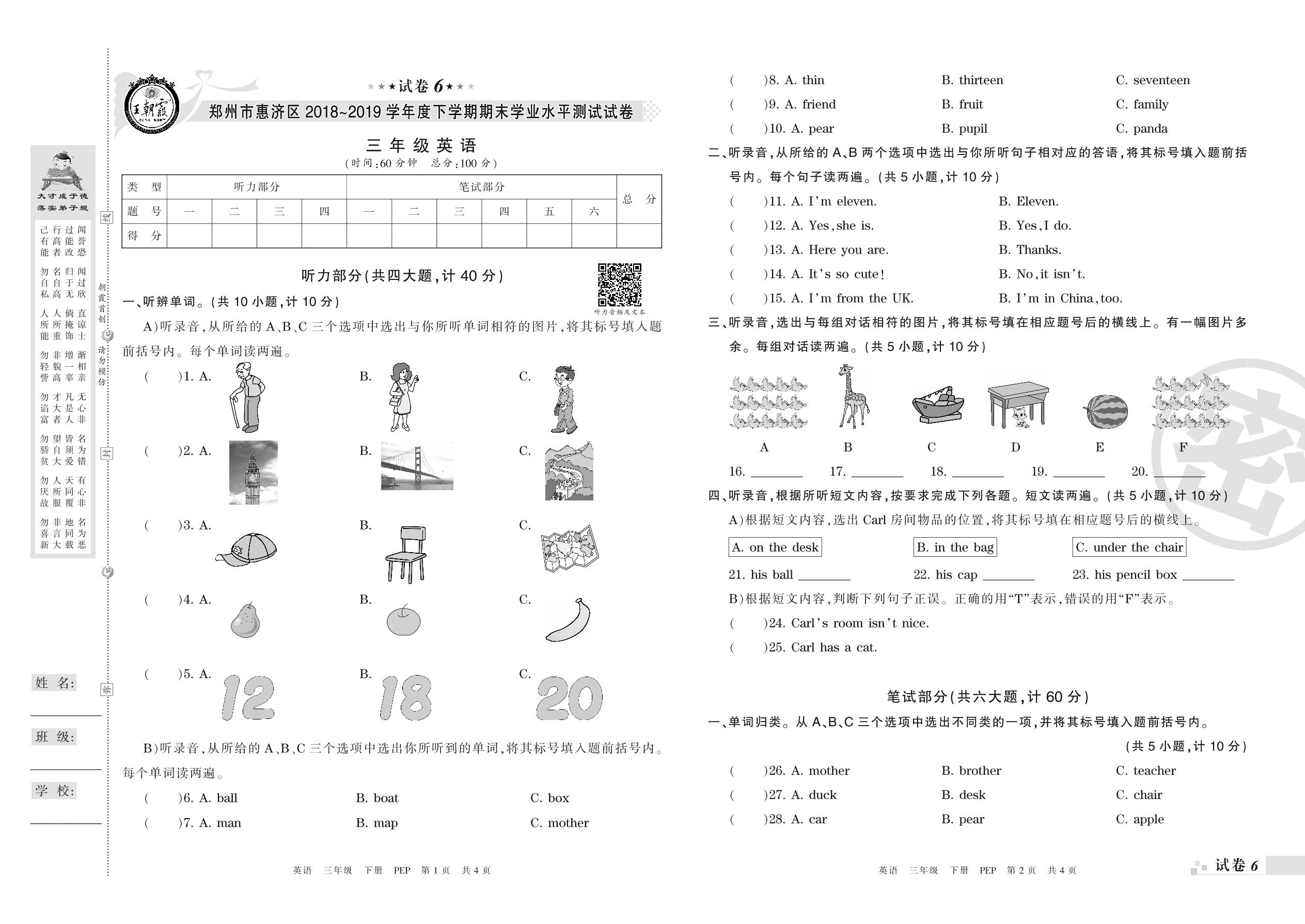 2018-2019学年第二学期郑州市惠济区三年级英语试卷(PEP版)【6】