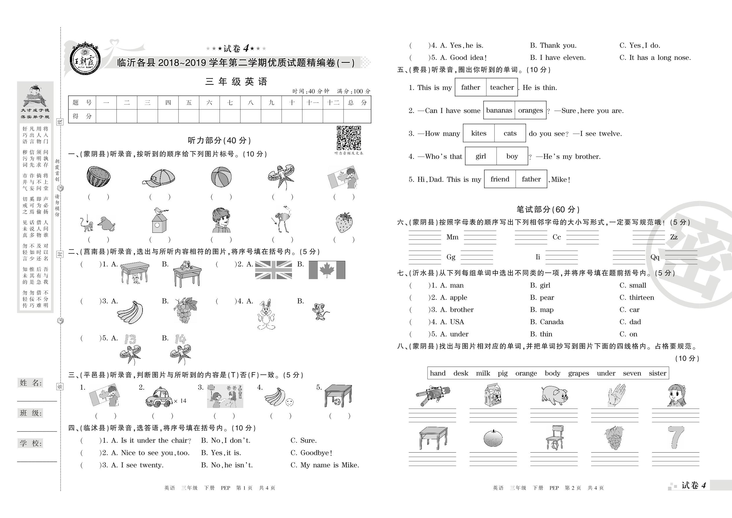 临沂各县2018-2019学年第二学期优质试题精编卷(一)三年级英语试卷(PEP版)【4】
