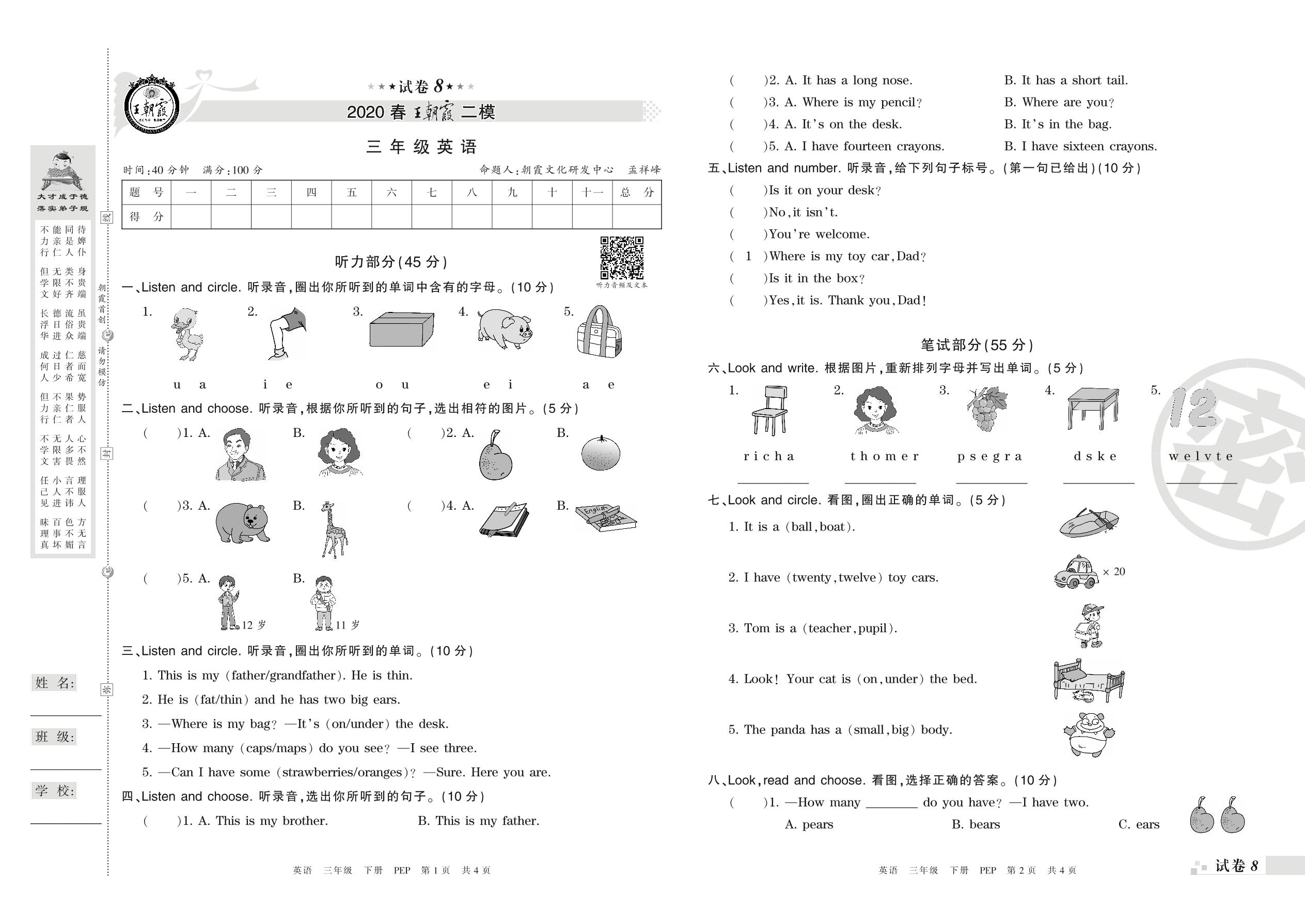 王朝霞期末模拟卷三年级下册英语(PEP版)_R210806185238【8】