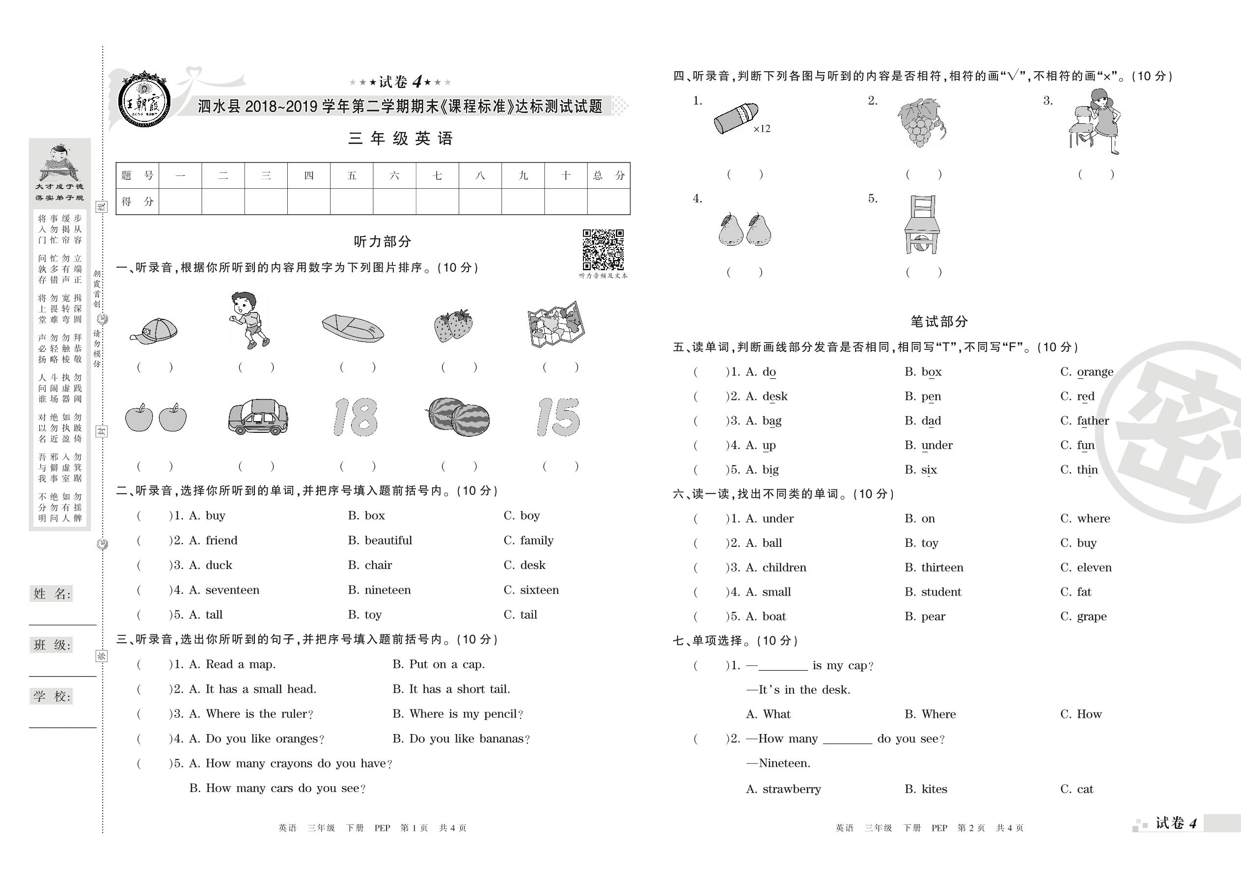 2018-2019学年第二学期济宁市泗水县三年级英语试卷(PEP版)【4】